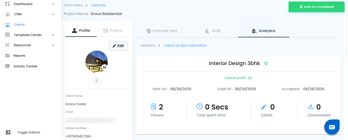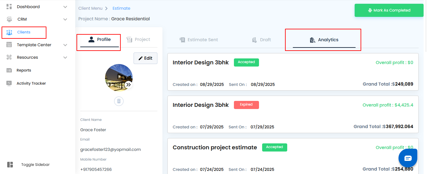Step 2: Click on the estimate, you can able to view the analytics for the estimate.