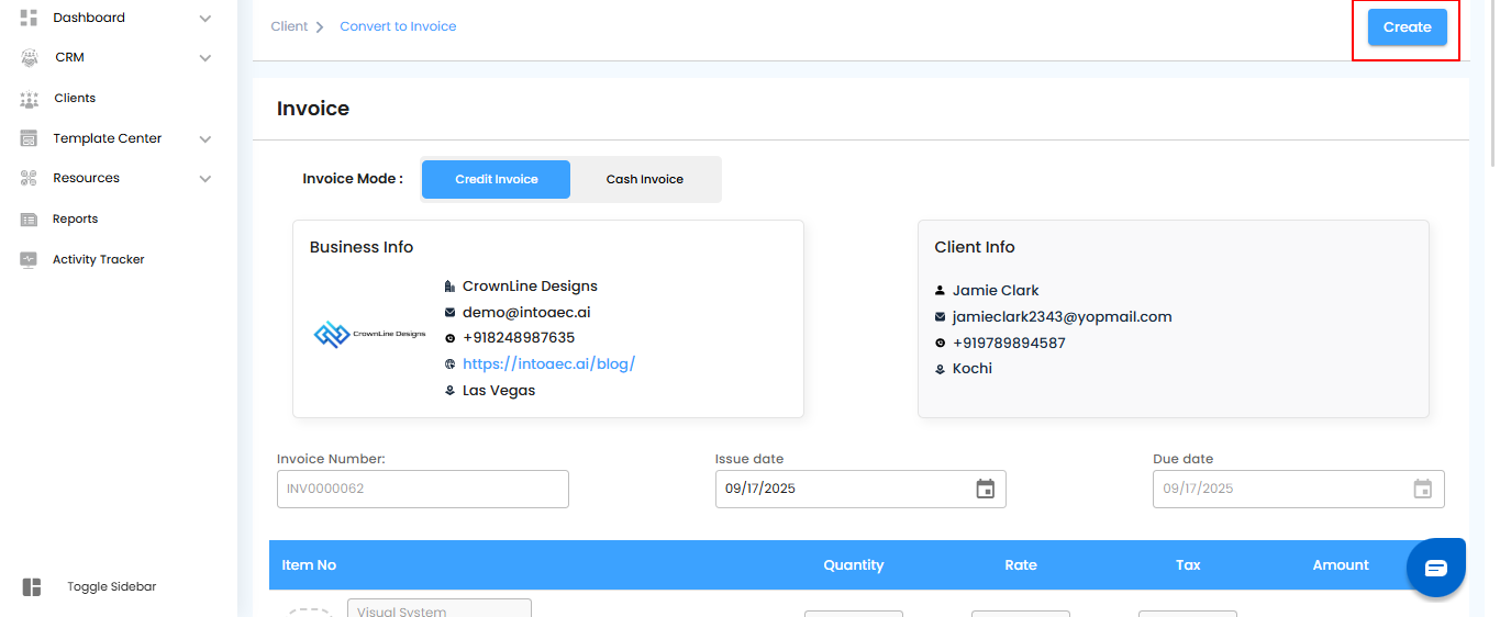 - Click the Create button to finalize the invoice.