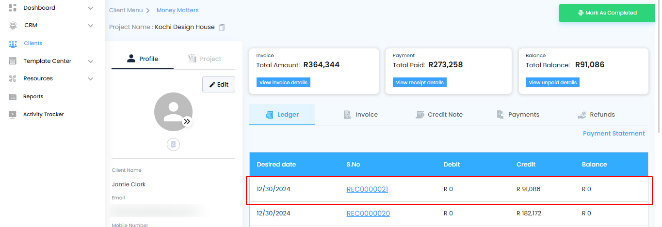 - Once finalized, the invoice will be created and automatically displayed in the Ledger under Money Matters.