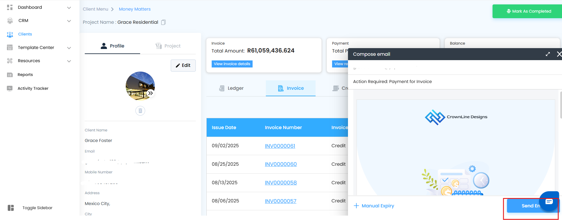 - A Compose Mail popup appears: - The client’s email ID is pre-filled.