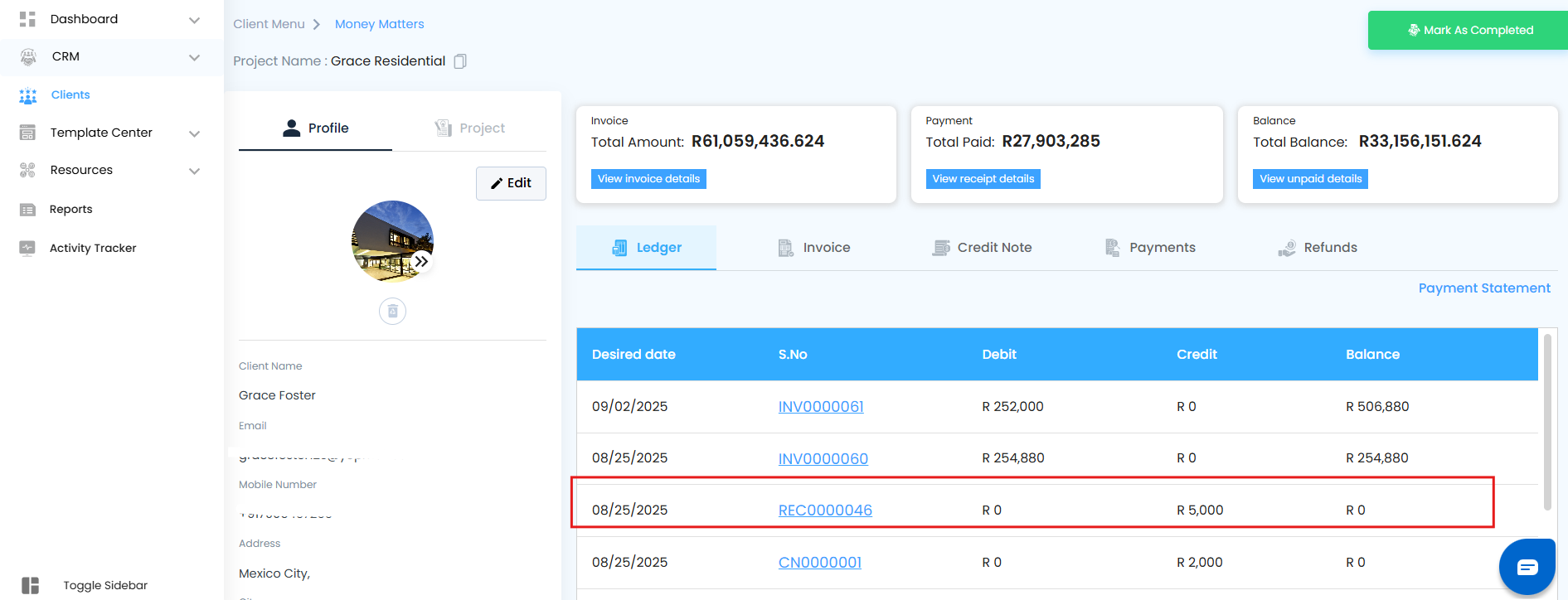 - The transaction is instantly reflected in the Ledger under Money Matters.