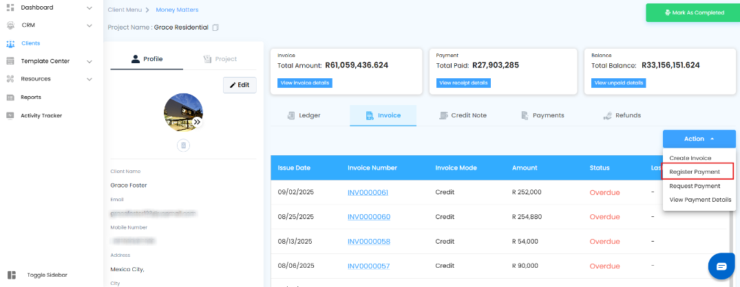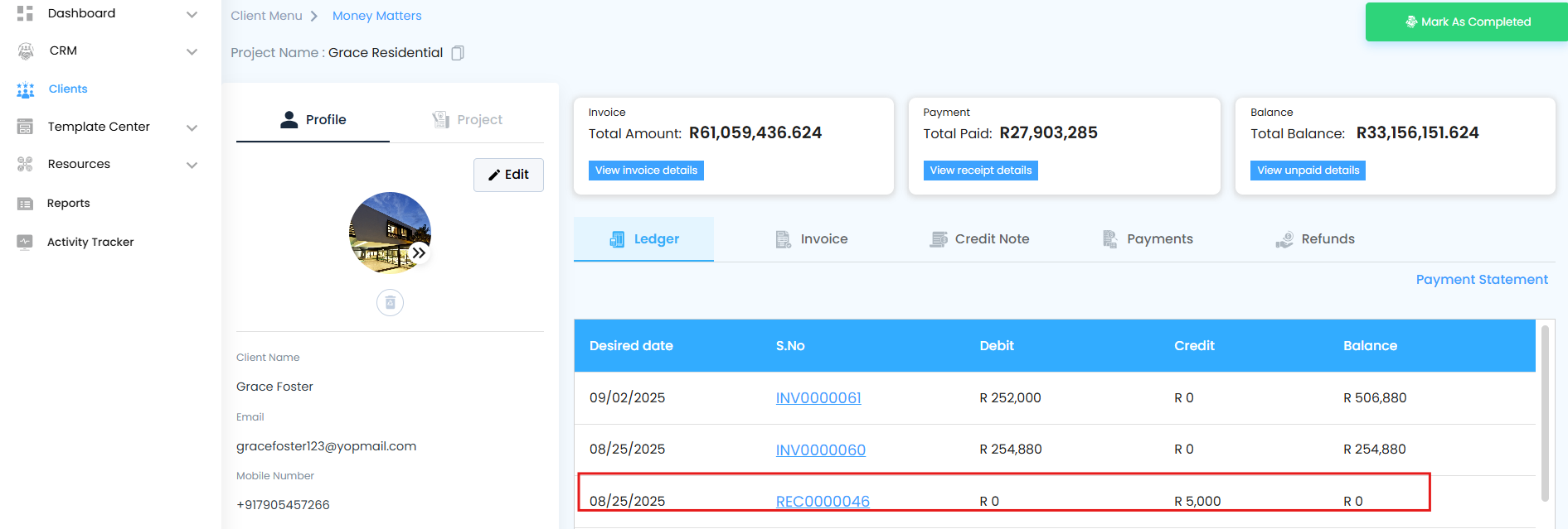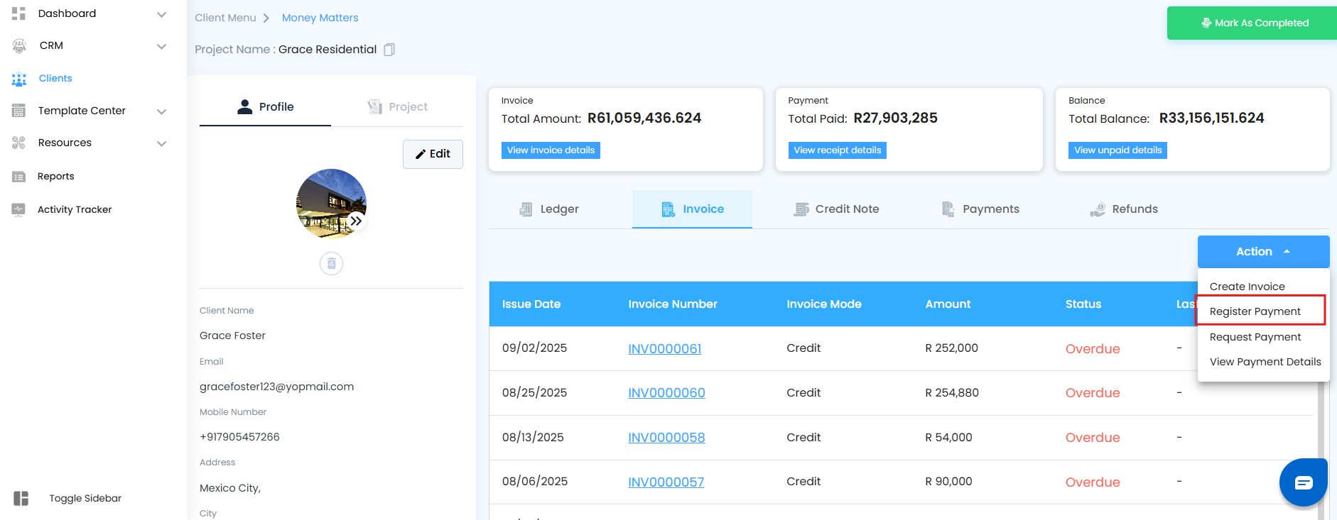 The Register Payment feature in IntoAEC helps you capture client payments seamlessly, ensuring every rupee is tracked and reflected instantly in the ledger.