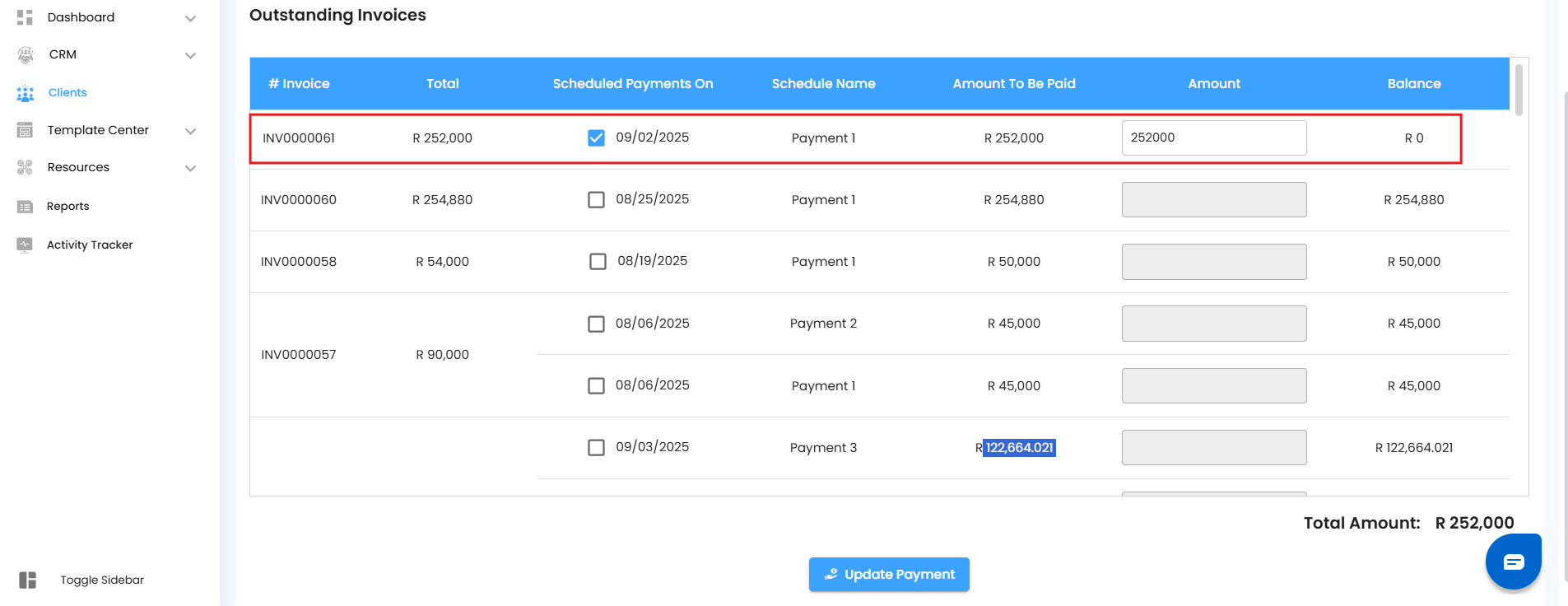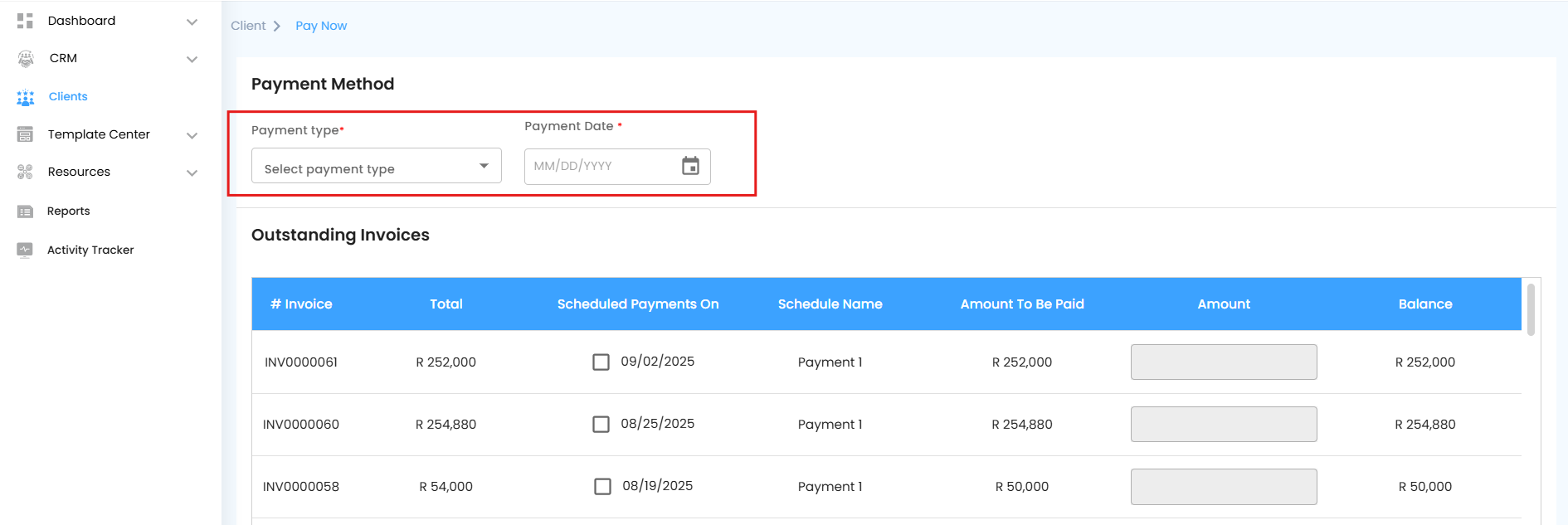 This ensures flexible handling — whether the client pays a full invoice, a scheduled installment, or even a partial amount.