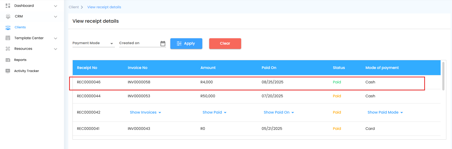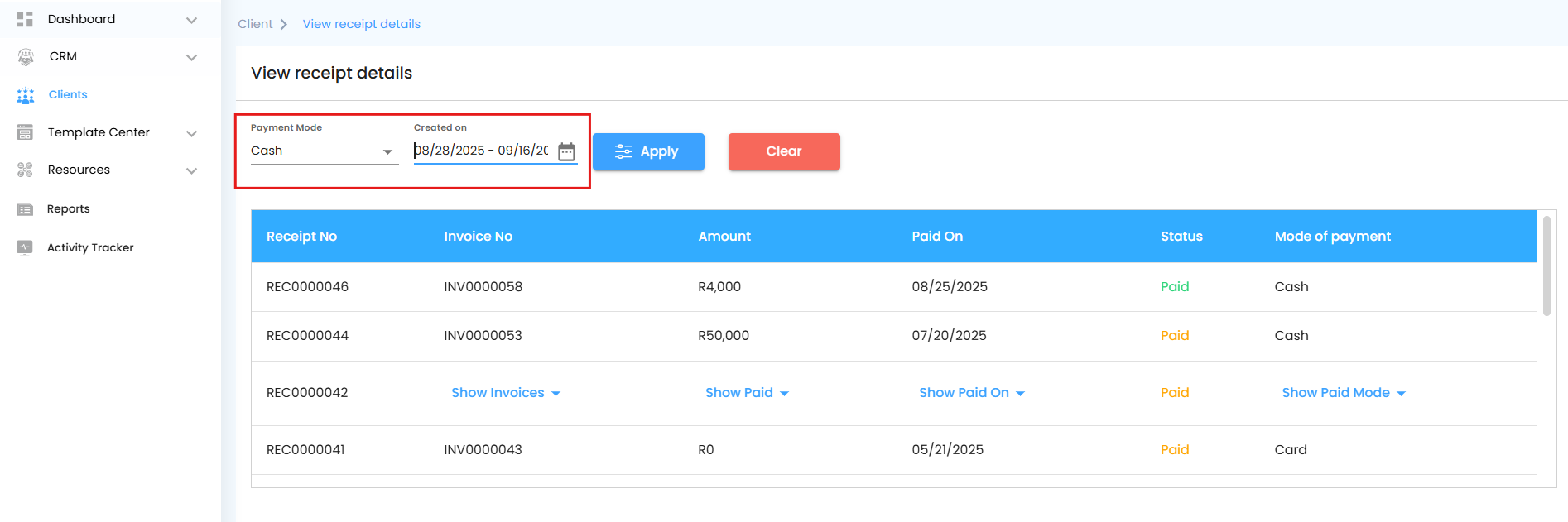 - Click Apply → Instantly view a filtered list of receipts tailored to your search.