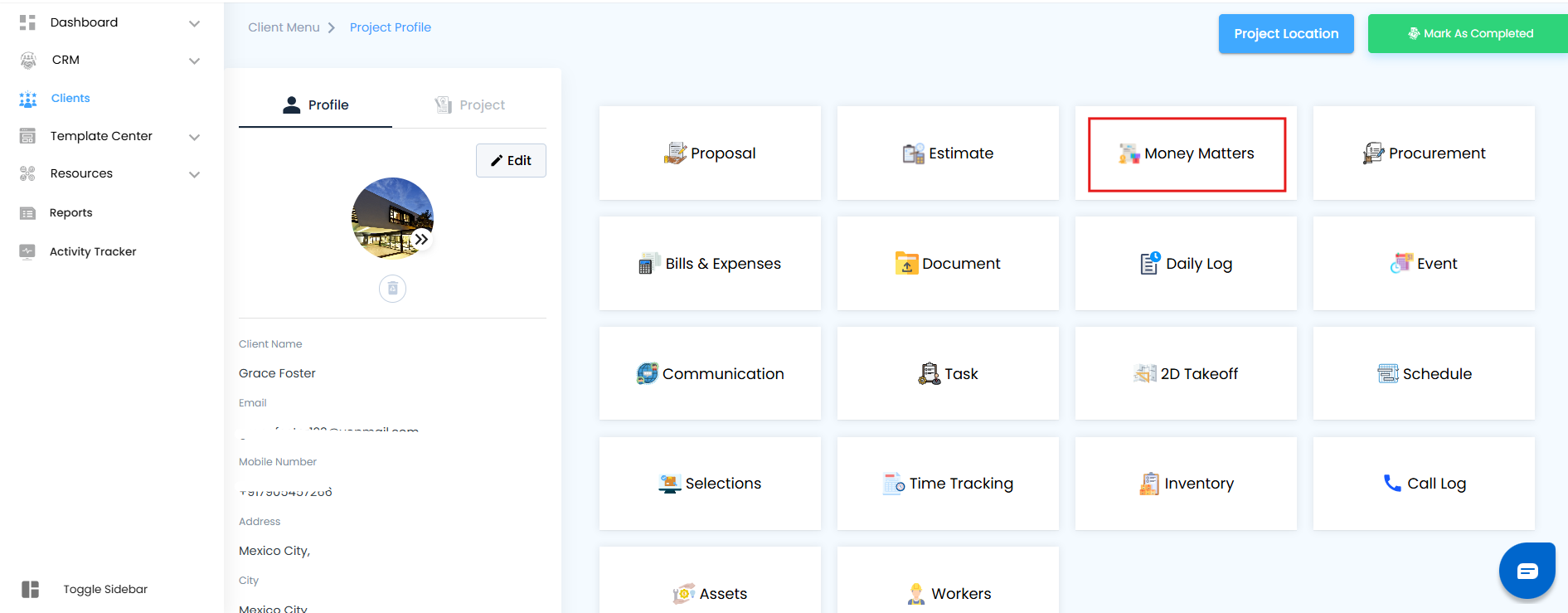 Go to Clients → Select Your Client → Money Matters. This opens the financial hub for that client, showing all invoices, receipts, and payment records.