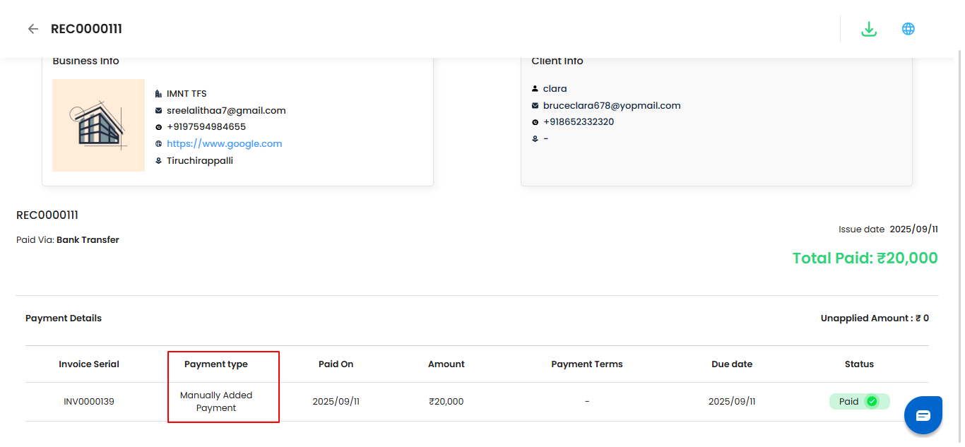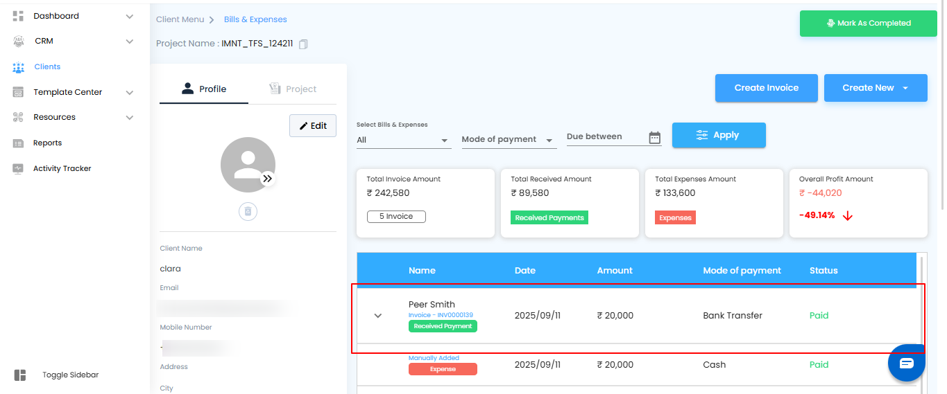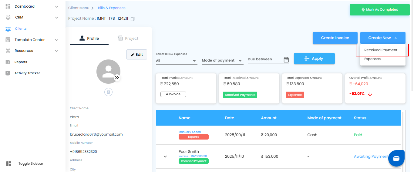 - Once the received payment is added, it will automatically appear in both the Bills and Expenses sections and Money Matters, ensuring complete visibility and accurate tracking of your financial transactions.
