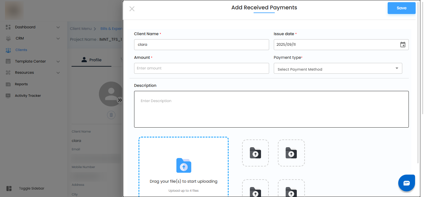 - Save: Click this button to submit the payment information you’ve entered and record the received payment in the system.