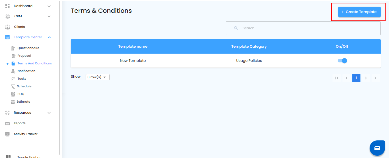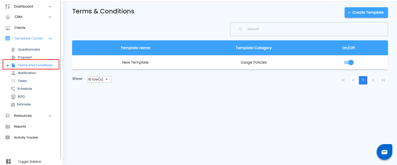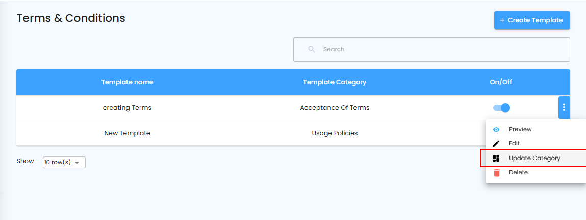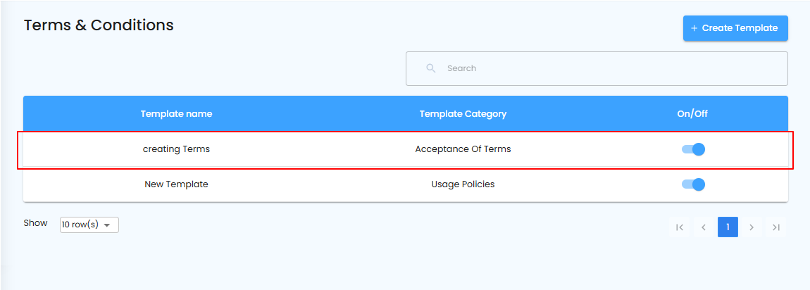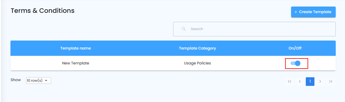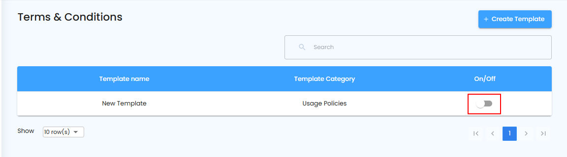 The Show/Hide toggle allows you to manage which Terms and Conditions templates are visible or hidden, giving you better control over template access.