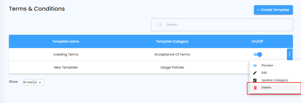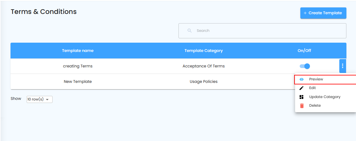 The Terms and Conditions feature offers tools to view, edit, and manage your templates efficiently.