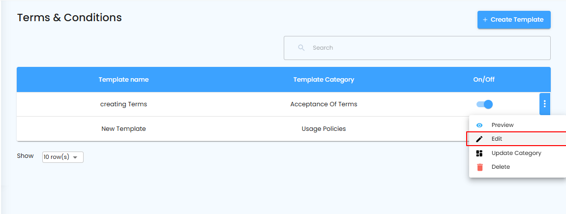 - Select Edit to make changes to the content of your Terms and Conditions template.