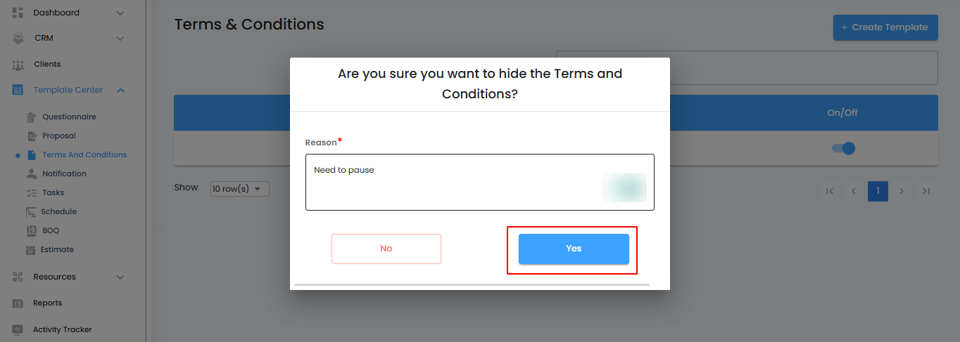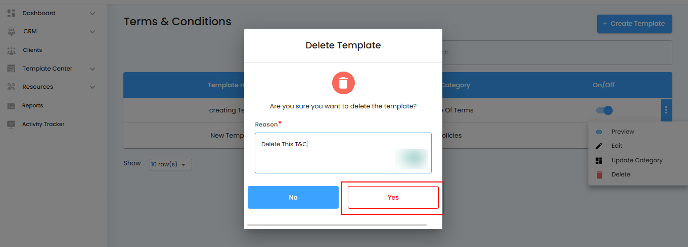 - Enter the reason for deleting the Terms and Conditions in the pop-up window.