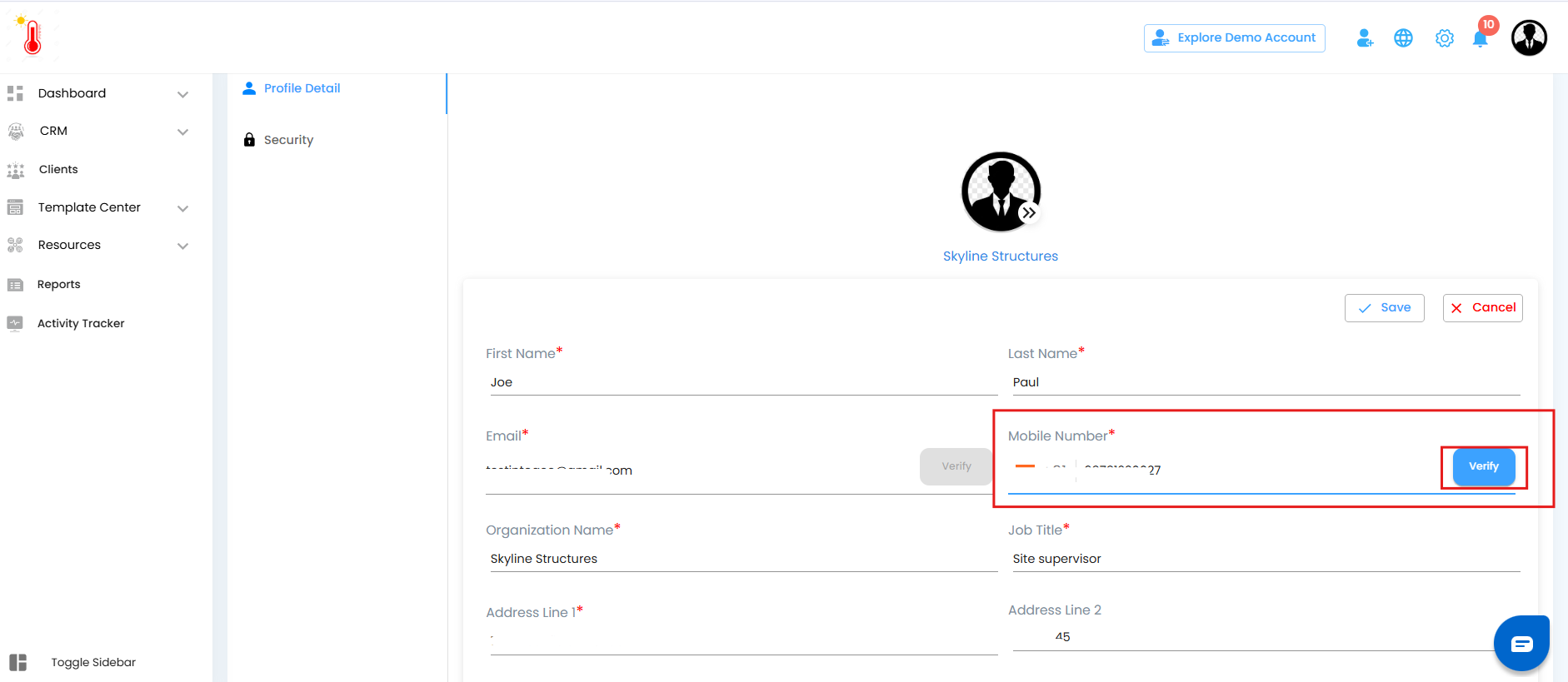 Type your new mobile number into the Mobile Number field. Click Verify to send a code to your new number.
