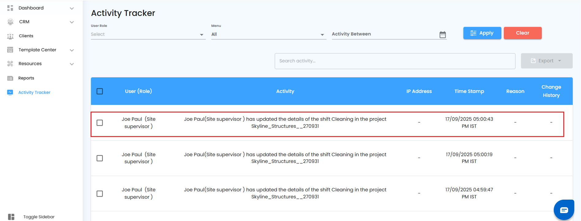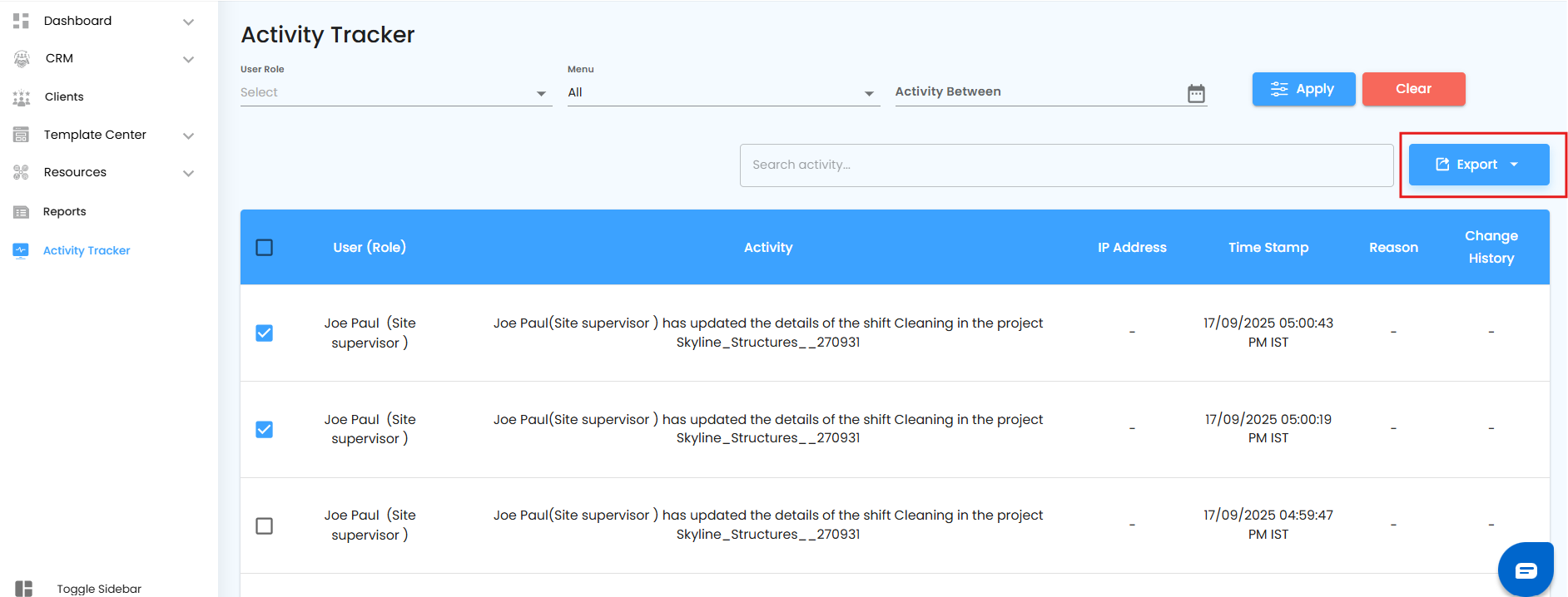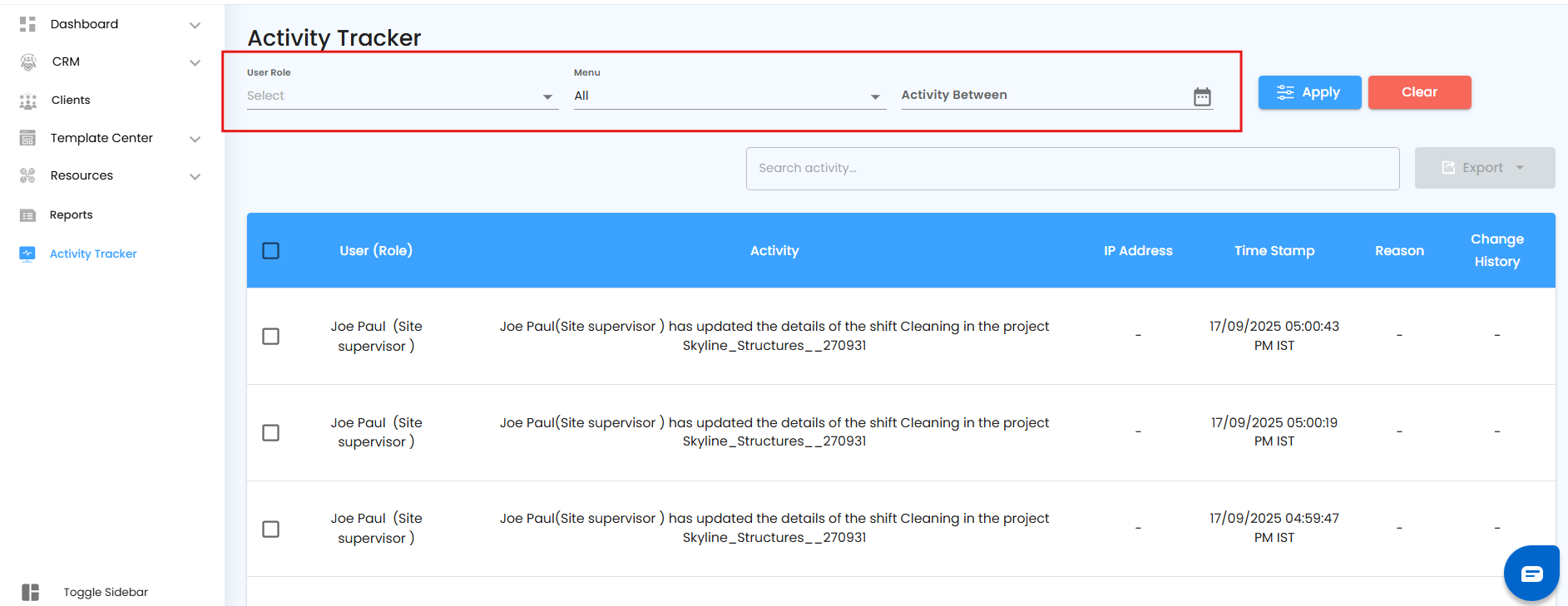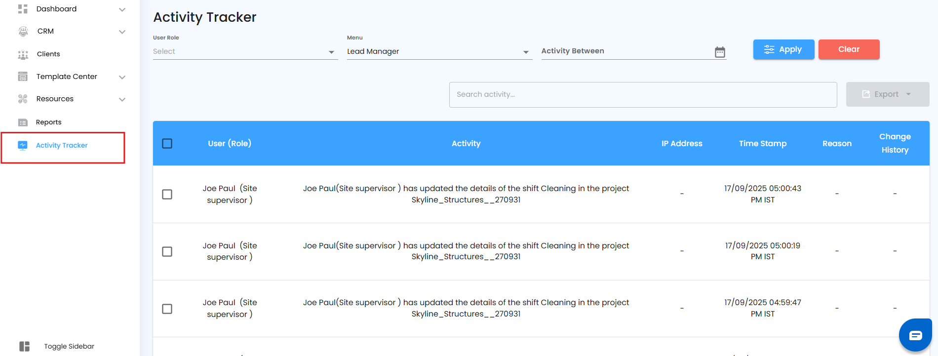 The Activity Tracker in IntoAEC is your all-seeing dashboard for monitoring user actions, keeping operations transparent, and ensuring accountability across the portal. Whether you’re tracking project updates, financial actions, or team logins — everything is logged neatly for you to review.