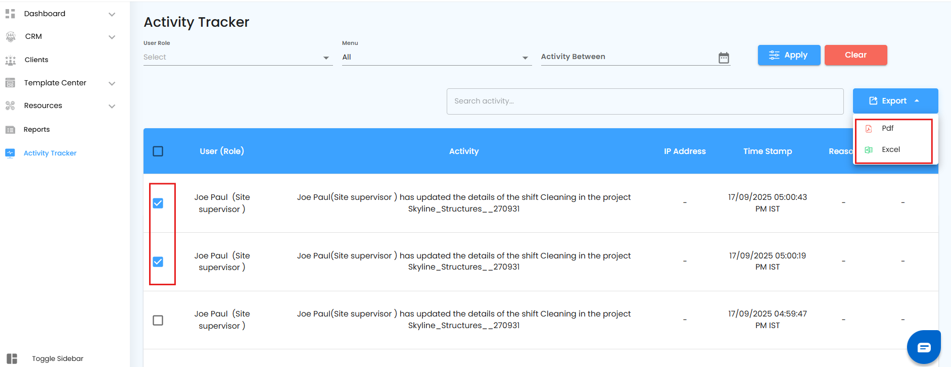 - Choose Your Format: Export your chosen logs into PDF (for clean reports) or Excel (for detailed analysis).