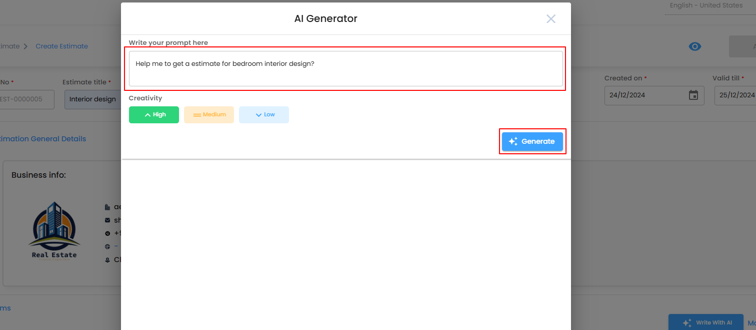 - Select the Creativity Level (High, Medium, Low) to control the tone: - High → Persuasive & client-winning.
