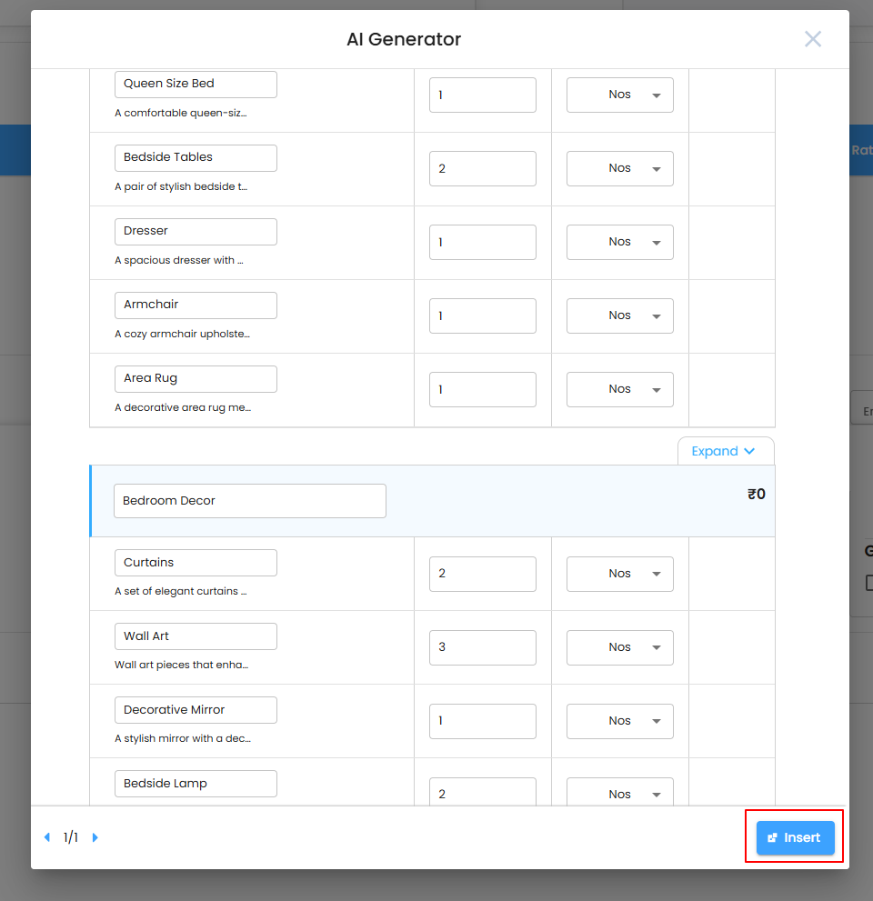 - Once satisfied, click "Insert" to seamlessly place the content into your estimate.