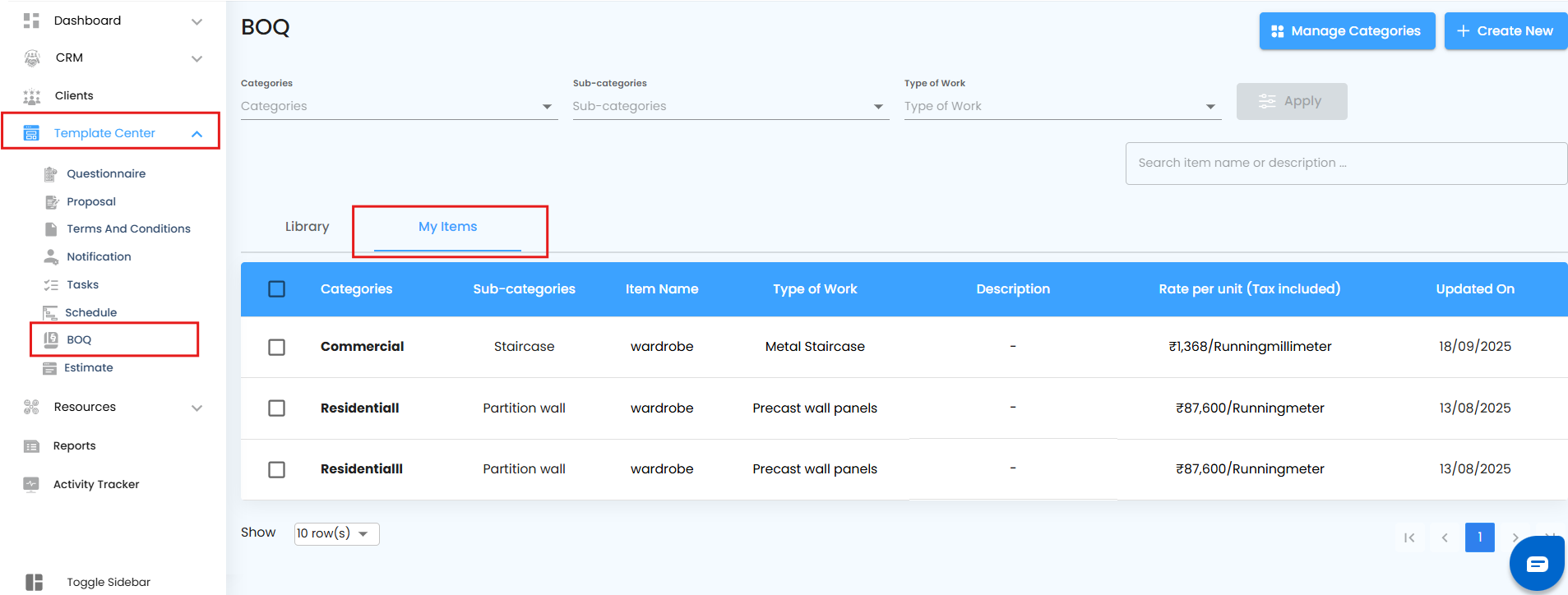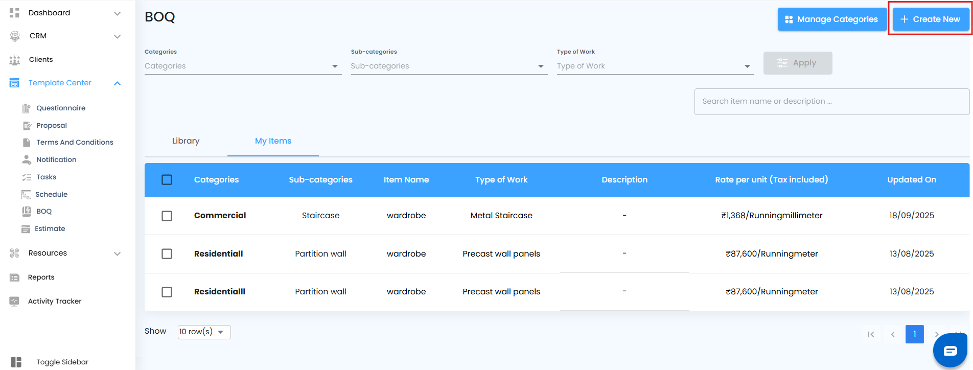 From the side menu, click on Template Center → select BOQ → then switch the tab to My Items. This is your personal workspace where every item you create is neatly organized and always at your fingertips.