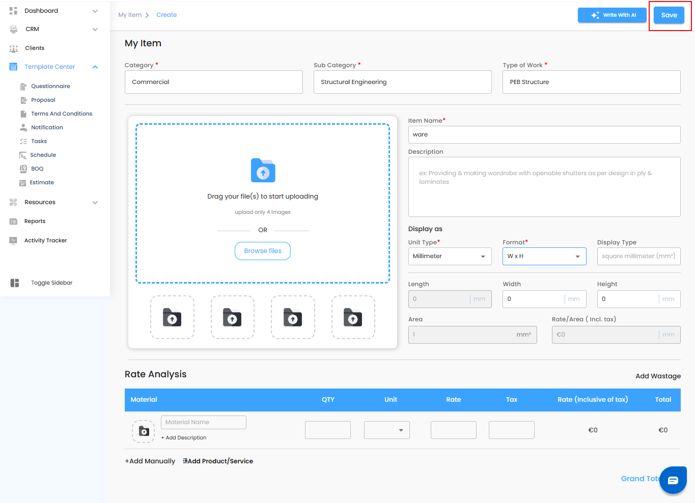 - Save the Item – Click the Save button to finalize and add the item to your BoQ.
