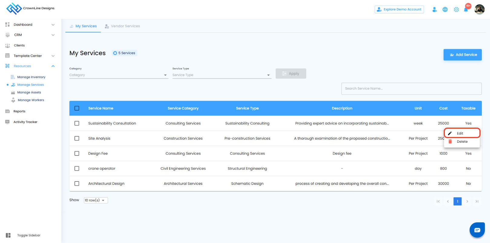 - Click the "Edit" option next to the service you wish to modify.