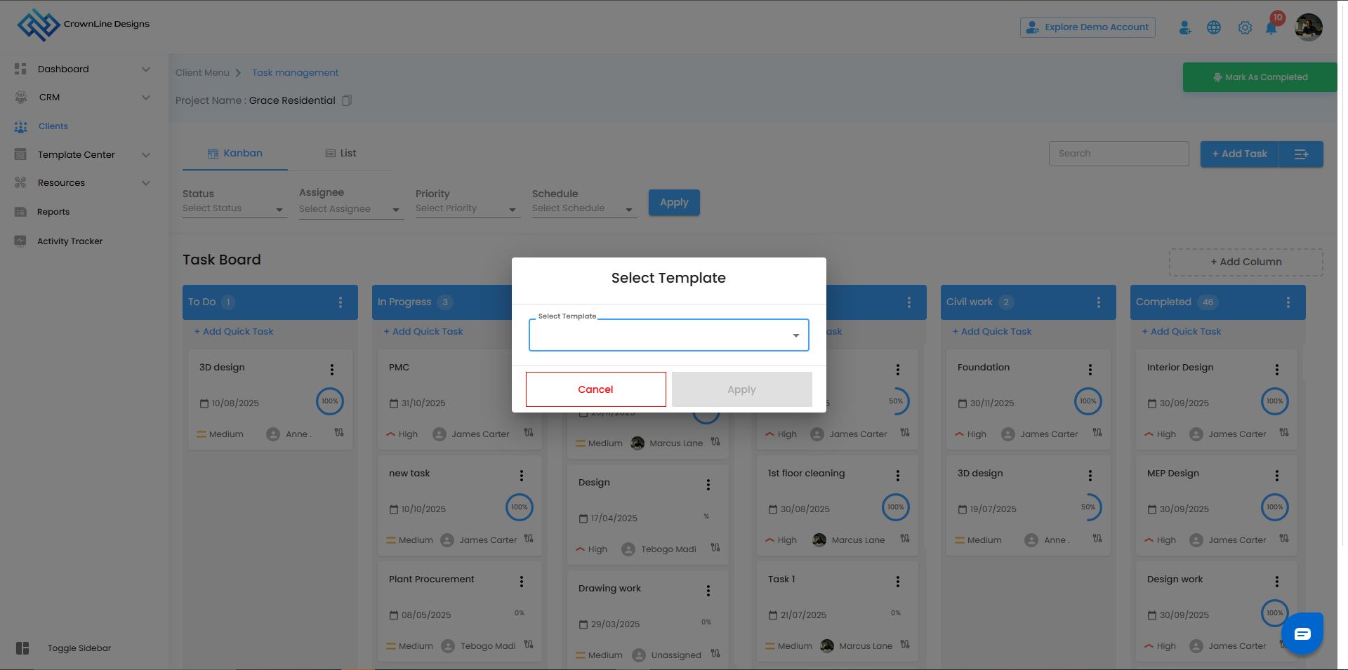 Instead of starting from scratch, you can add tasks directly from pre-defined Task Templates created in the Template Center.