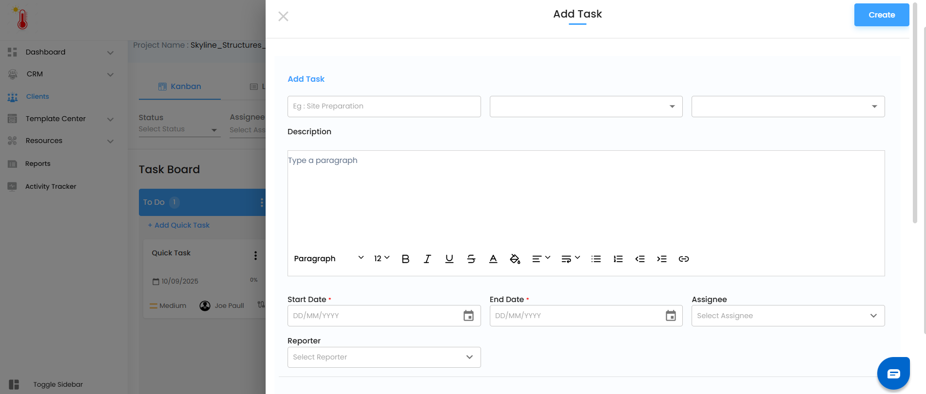 - When you click Create Task, a sleek half-canvas panel opens on the side.