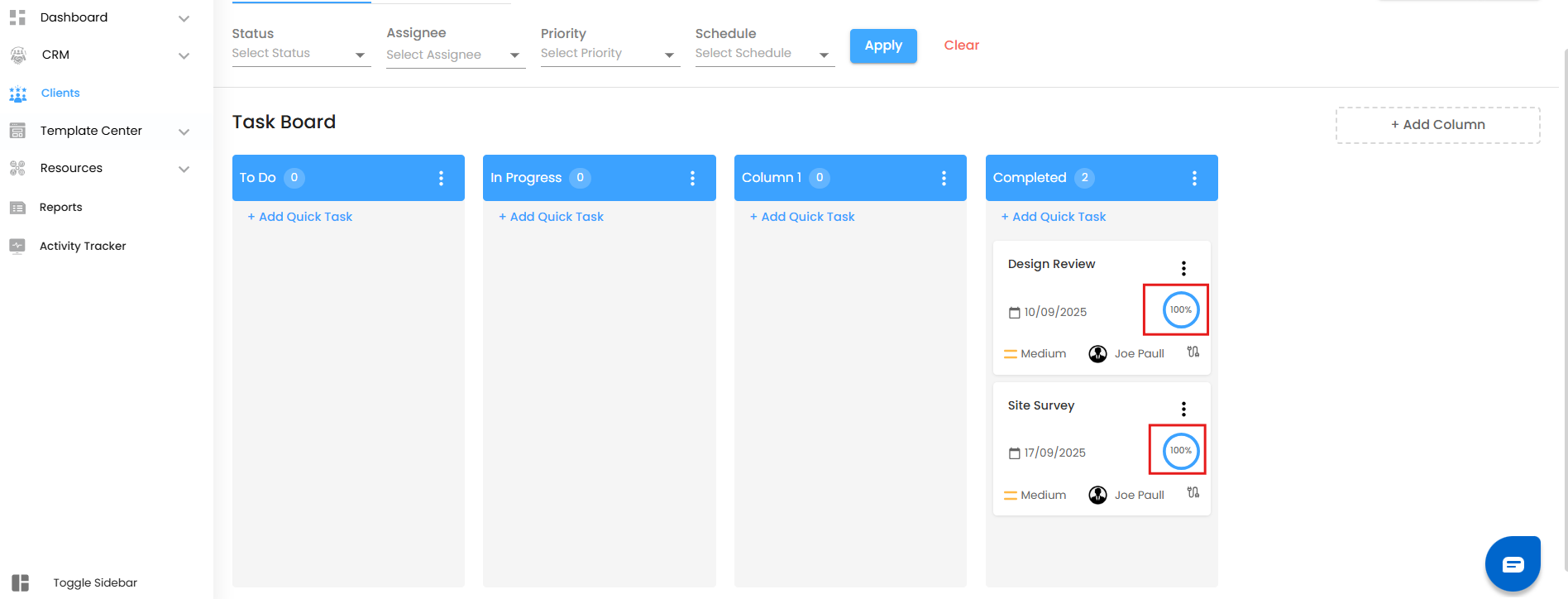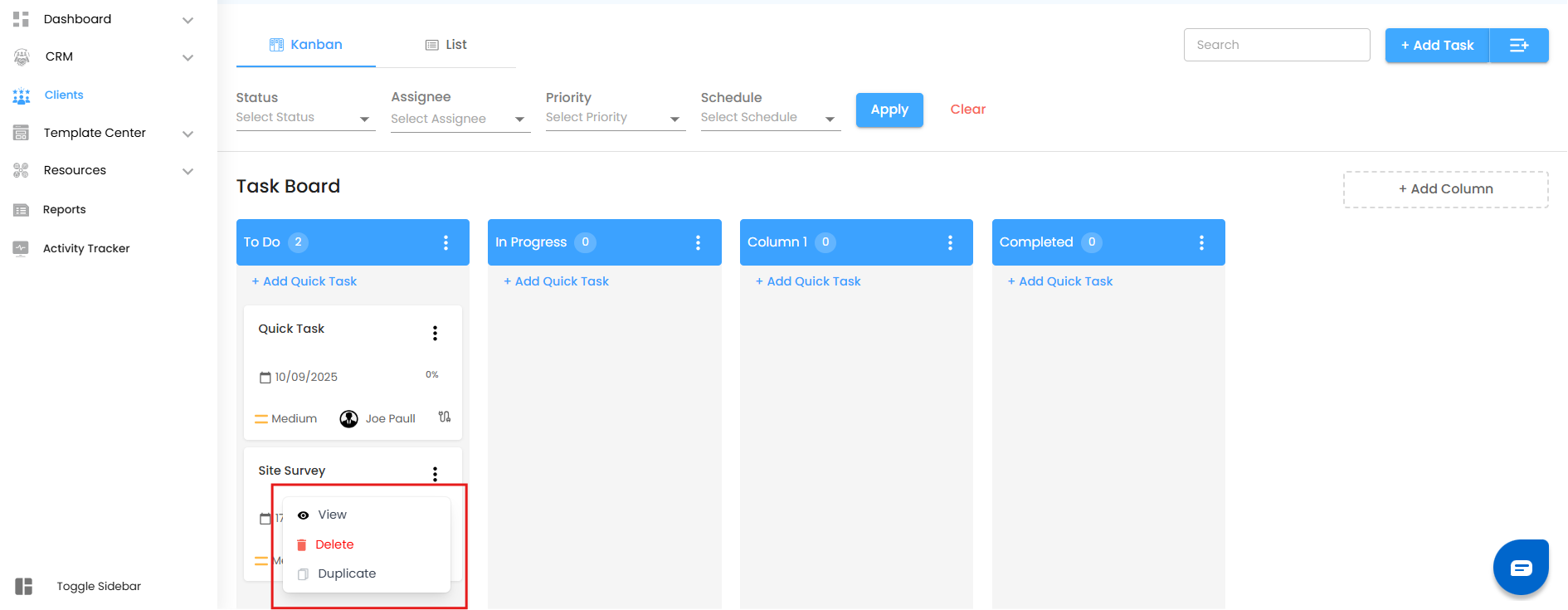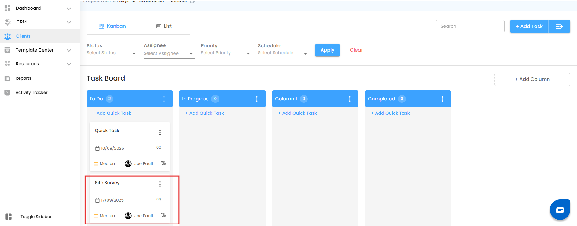 - Once saved, the task automatically appears in the To Do column (or whichever column you’ve set as your default).