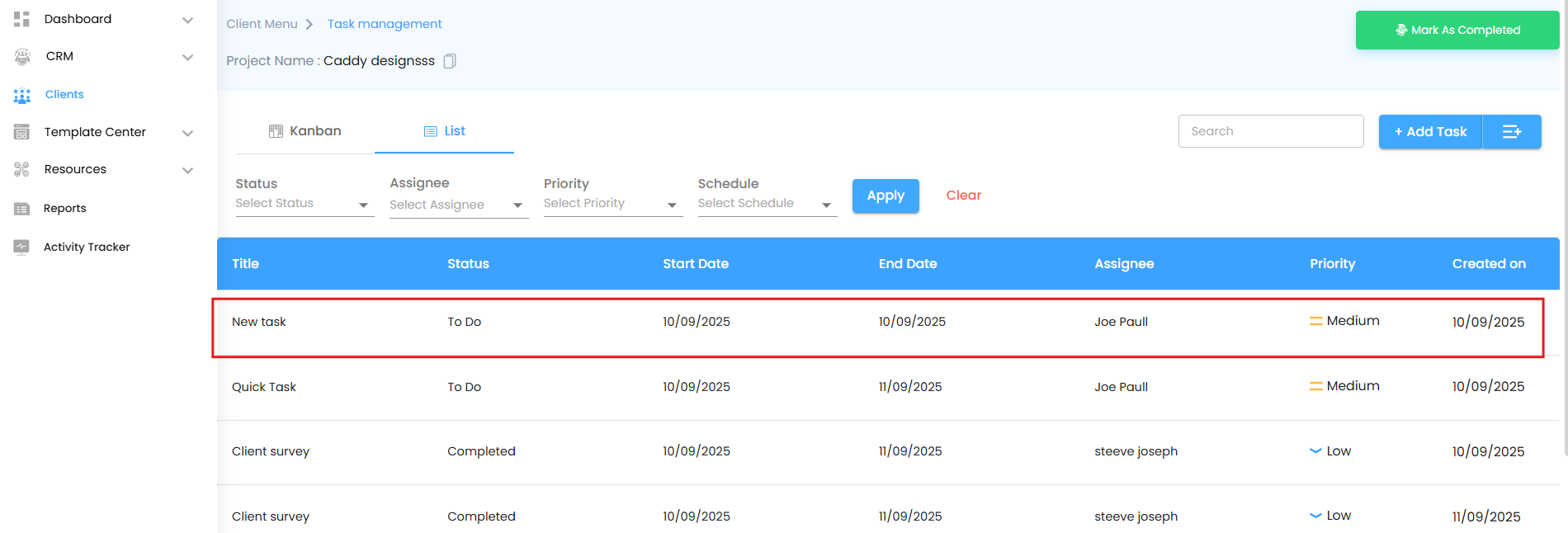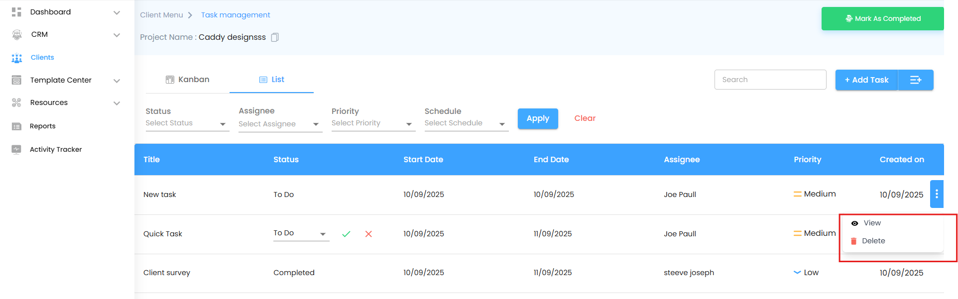 While the Kanban board gives you a visual flow, sometimes you just want the clarity of a table. That’s where List View comes in — a clean, structured way to see your tasks lined up with every detail in one glance.