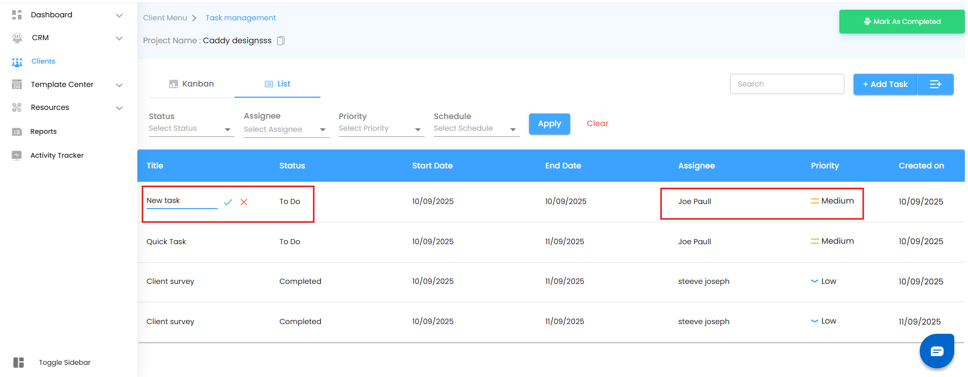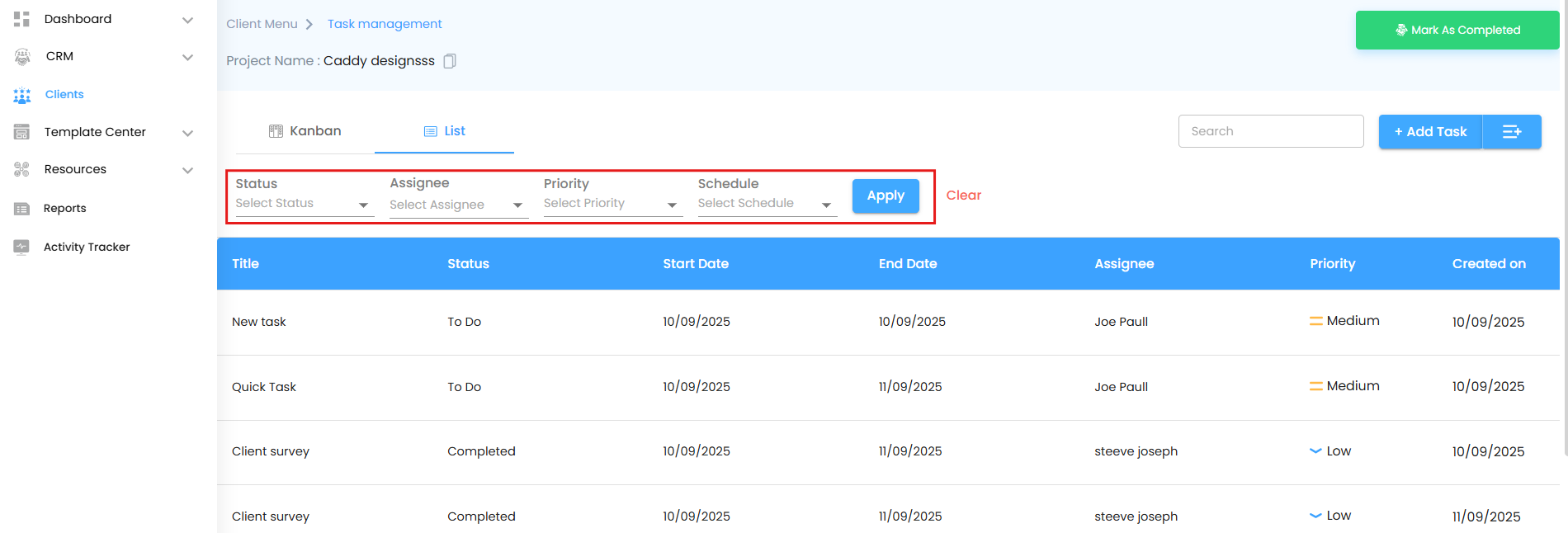 Filter tasks to see only what’s relevant (by status, assignee, or priority).