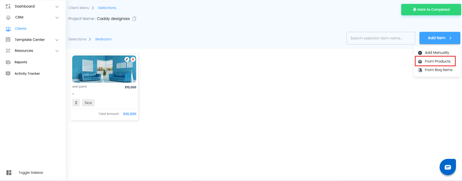 Choose From Products — and like magic, a Product Selection panel slides in from the side.