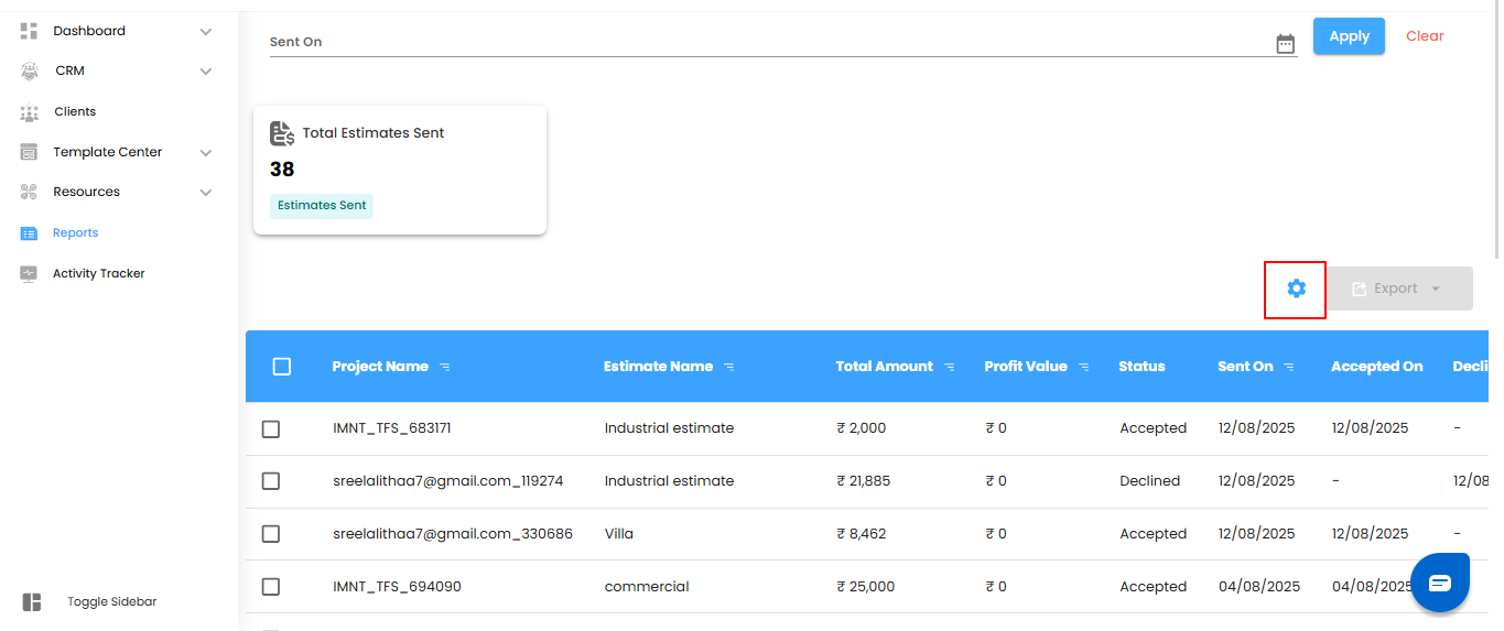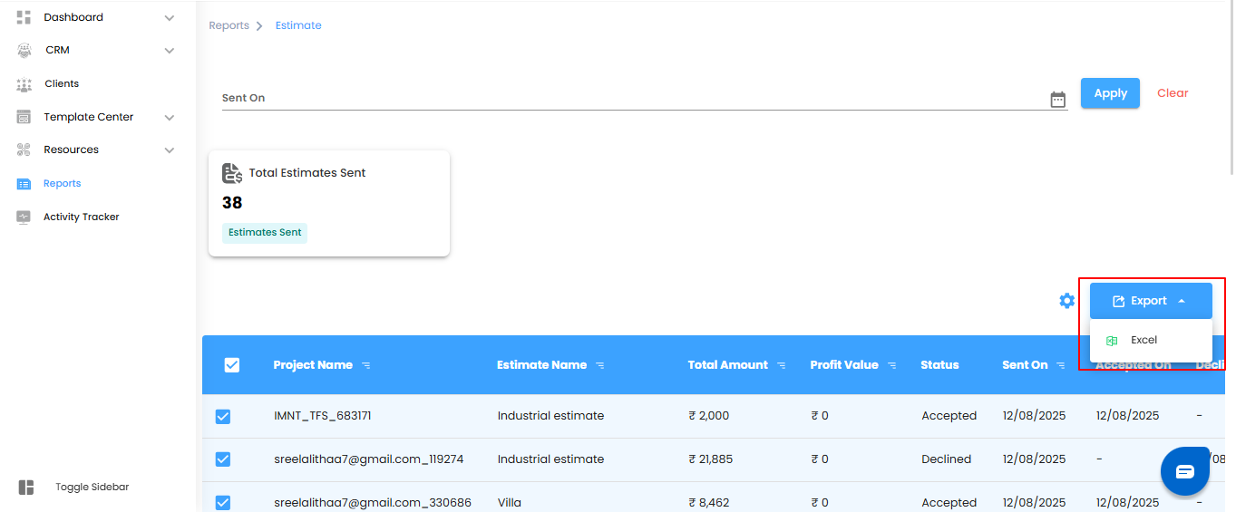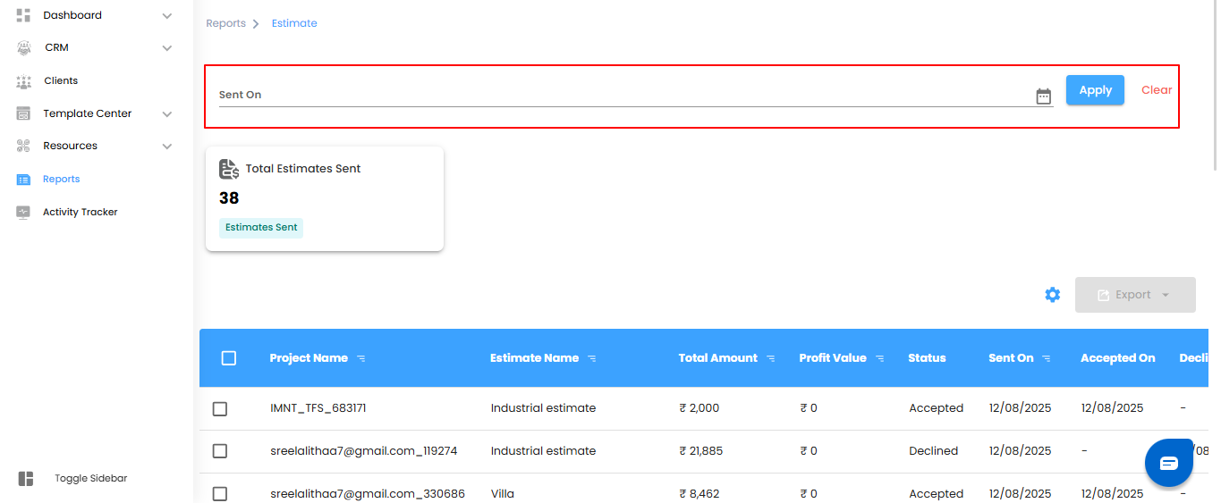 - Sent On – When the estimate was shared with the client.