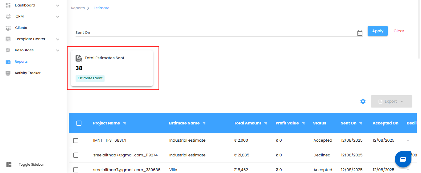 - Total Estimates Sent – See the total number of estimates shared with clients. It’s your quick pulse check on how active your projects are.