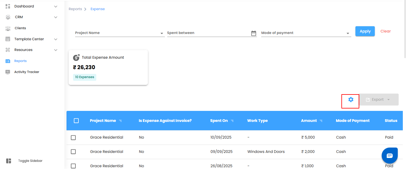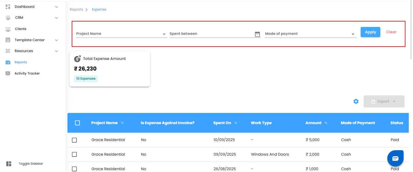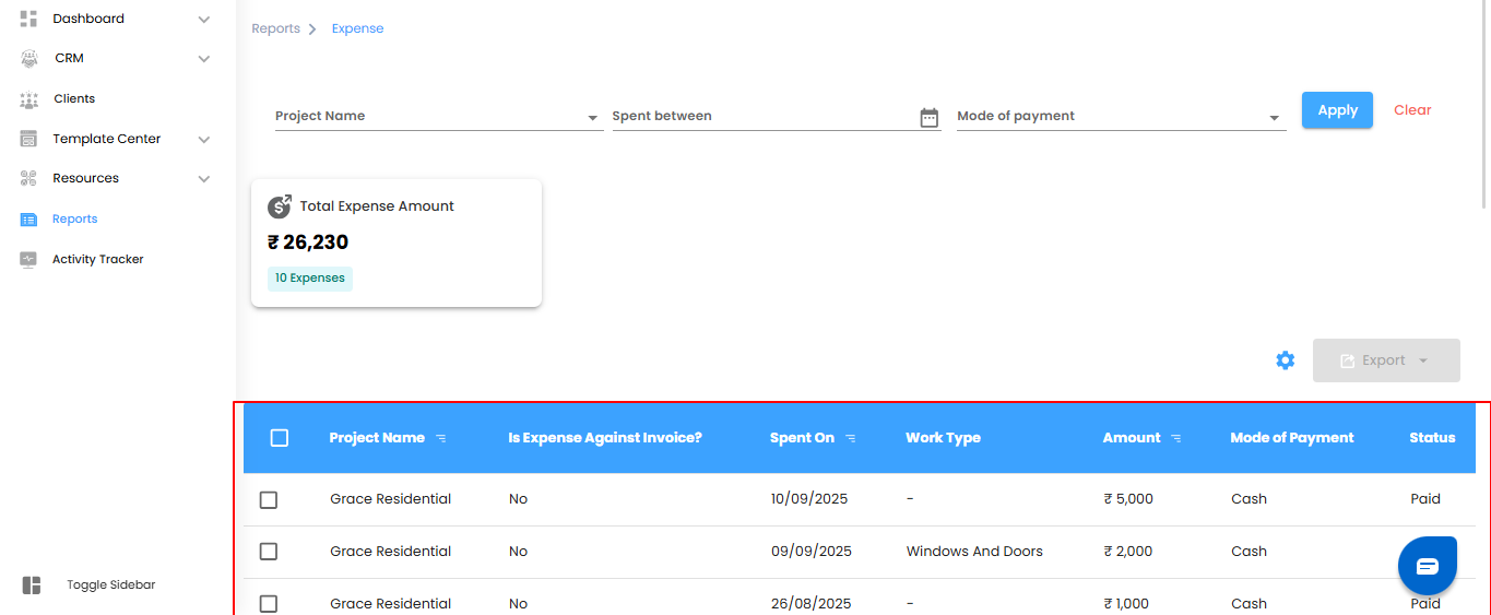 Think of the Expense Report as your project’s financial watchdog—keeping a close eye on every rupee spent. From payment methods to invoice details, this report gives you a clear picture of your expenditures, helping you stay on budget and make smarter financial decisions.