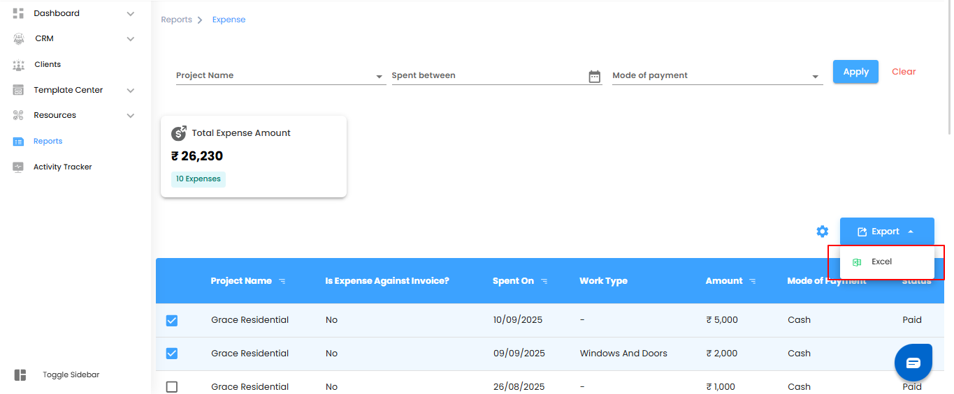 Pro tip: Combine filters with bulk actions—narrow down the expenses first, select multiple records, and export. It’s fast, organized, and keeps your project finances under control.