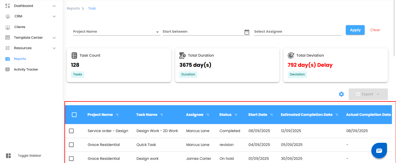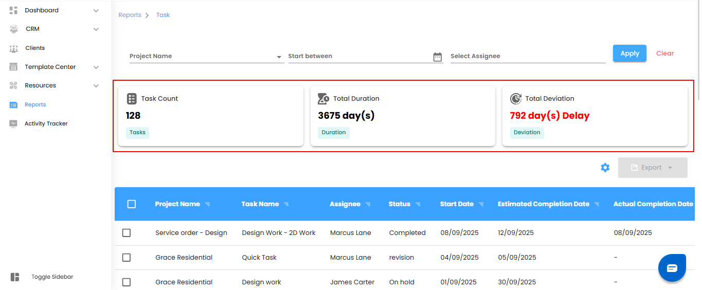 The Task Reports section lets you track tasks, monitor progress, and manage time effectively. Gain insights into task statuses, durations, and any deviations to keep projects on track.