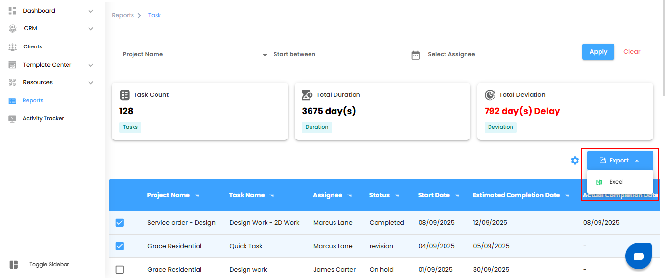 - Export to Excel – Download task details in Excel format for easy review, sharing, or reporting.
