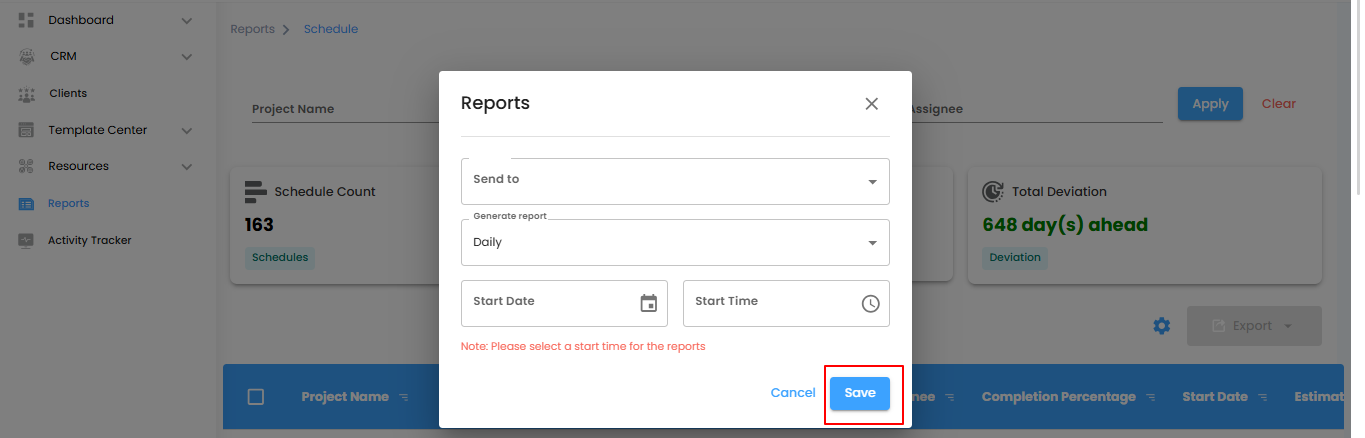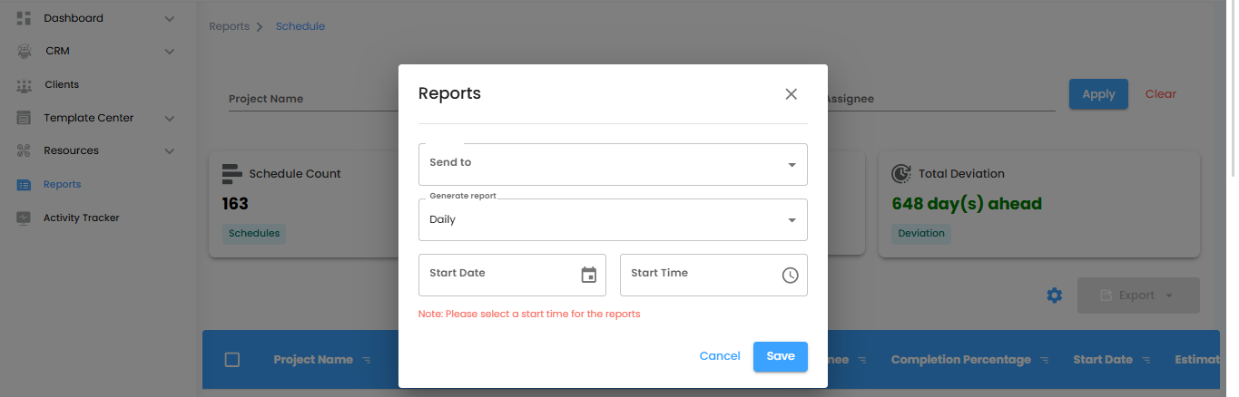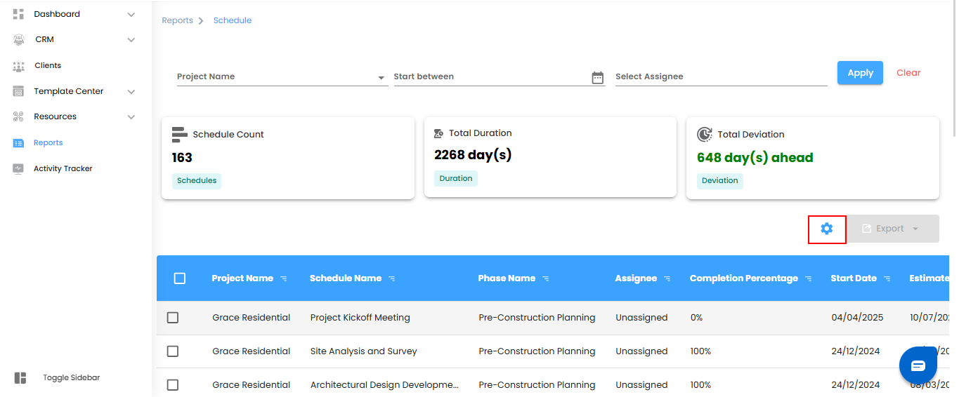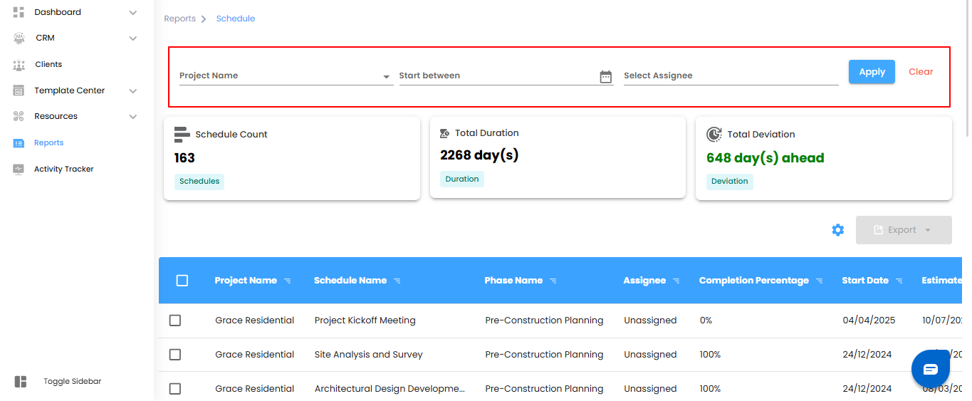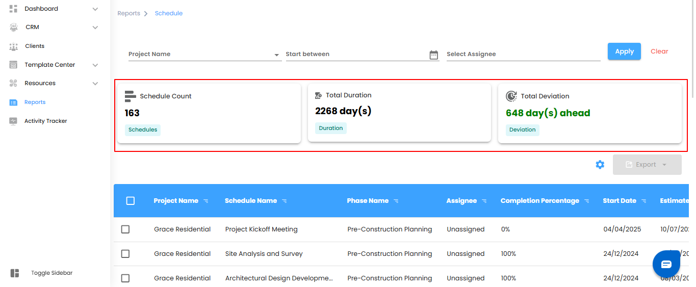 Schedule Reports give you a clear view of project timelines, task completion, and deviations—helping you manage schedules efficiently.