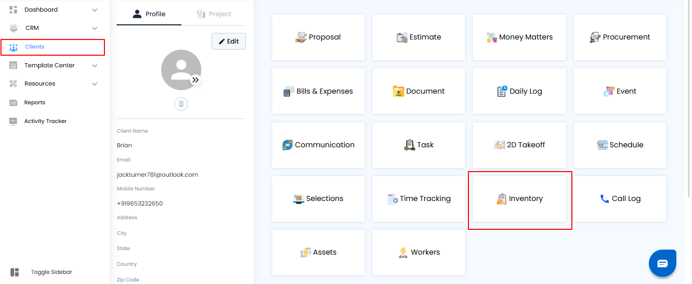 Click on the client whose inventory you want to access. This will open their profile or project details.