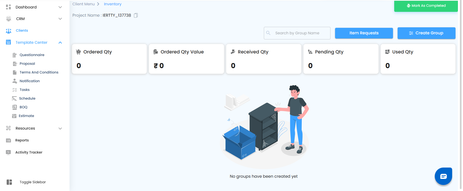 You’ll be directed to the Inventory Page, where you can manage and track materials for that client