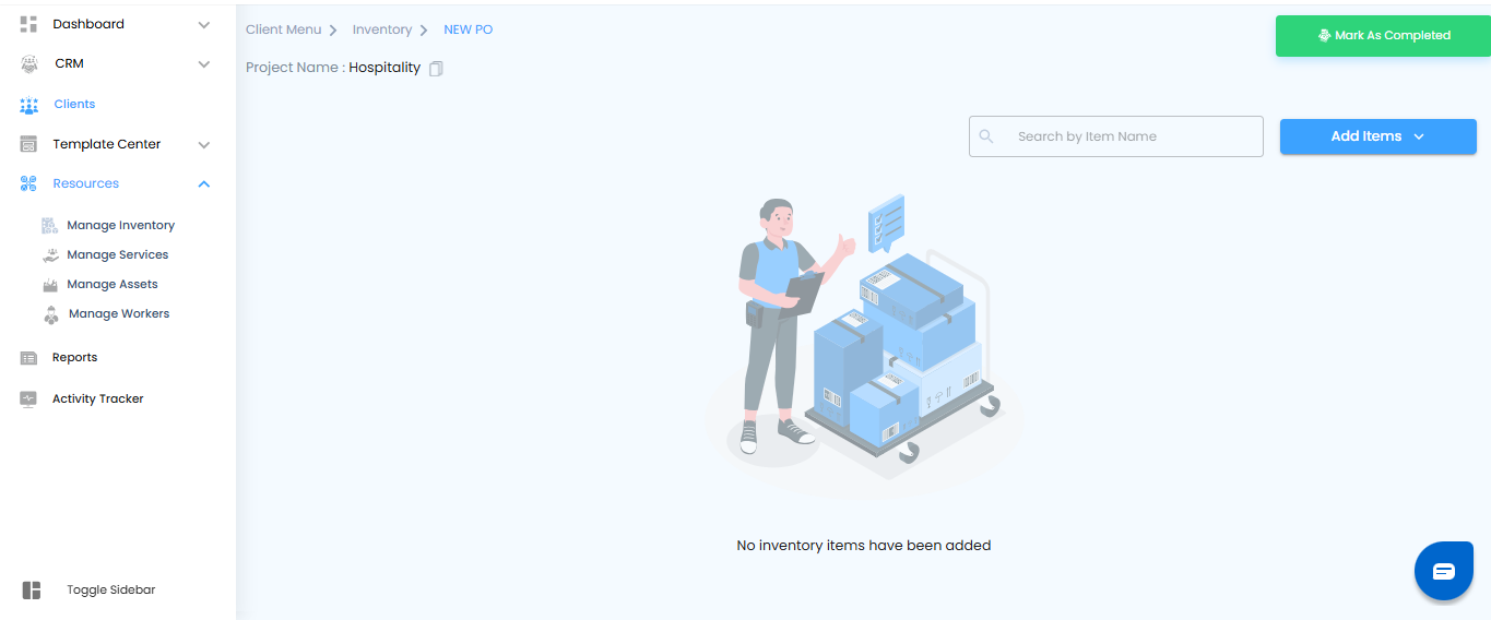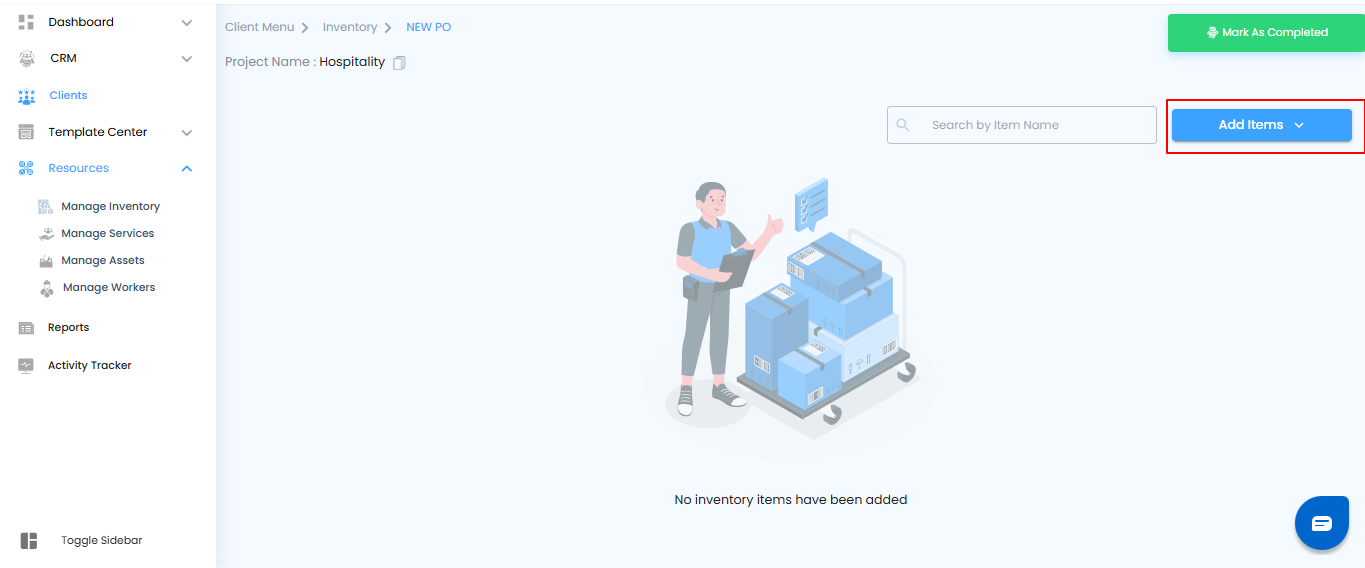 - If no items exist yet, you’ll see a message: “No Inventory Items have been Added.