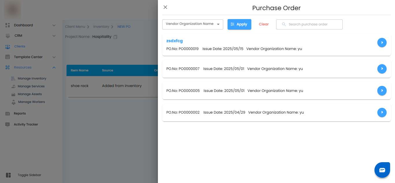 - When you open the PO selection panel, you’ll see a neatly organized list of all available and accepted Purchase Orders.