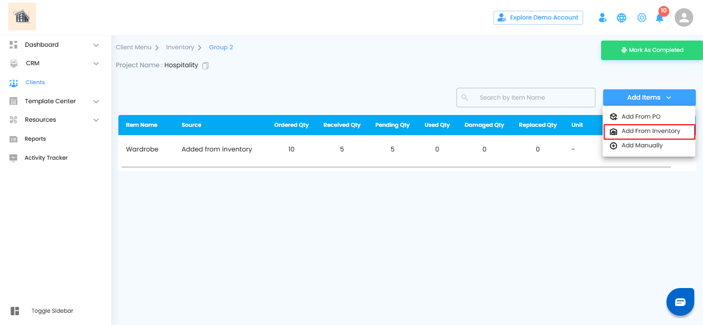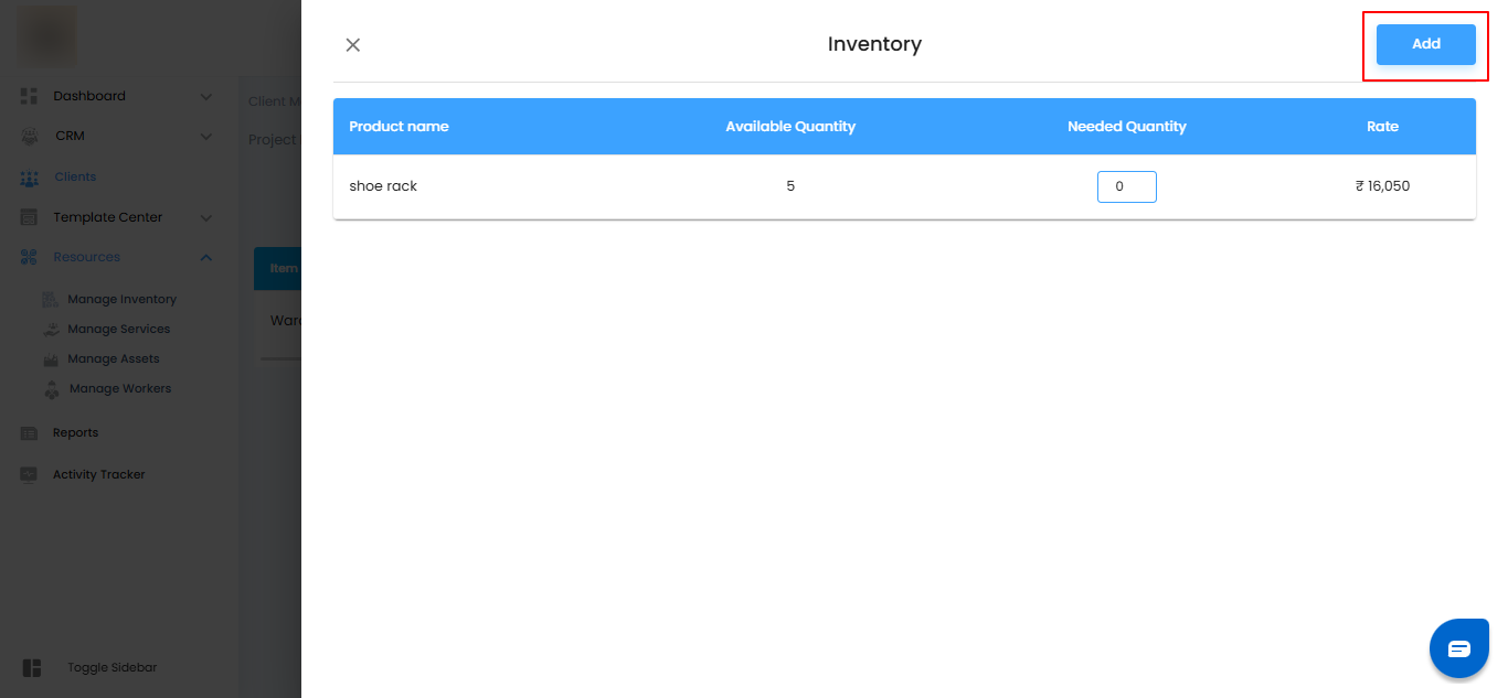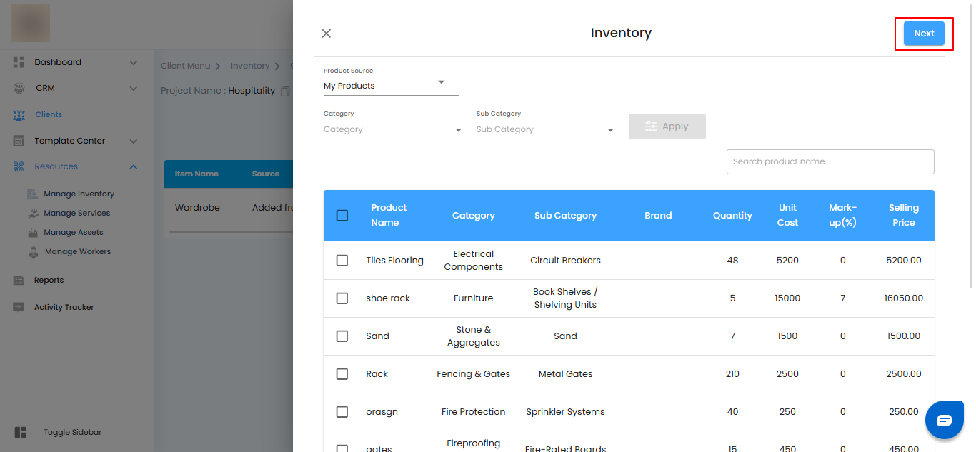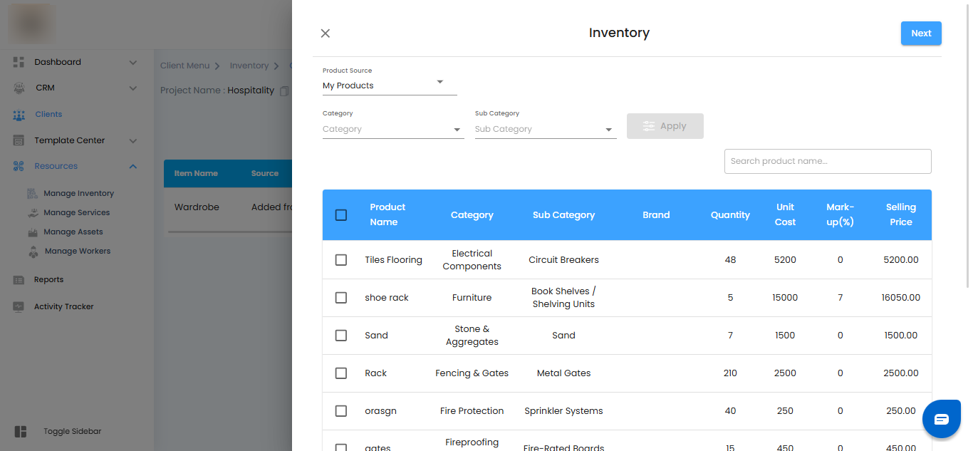 After opening the Add from Inventory panel, you can explore all available items in your central stock and pick exactly what your project or client needs.