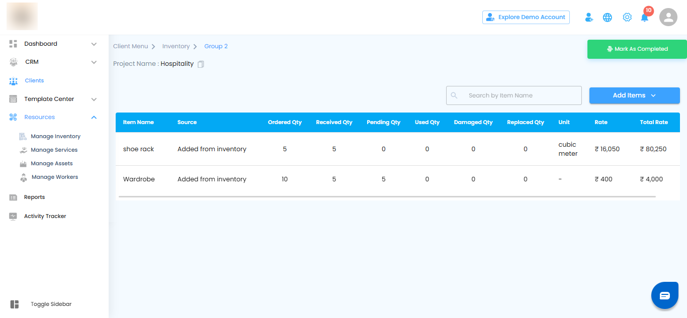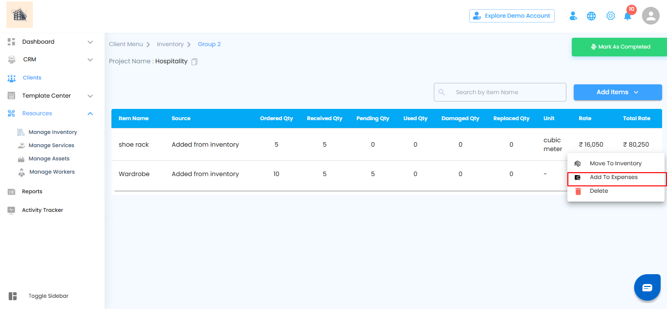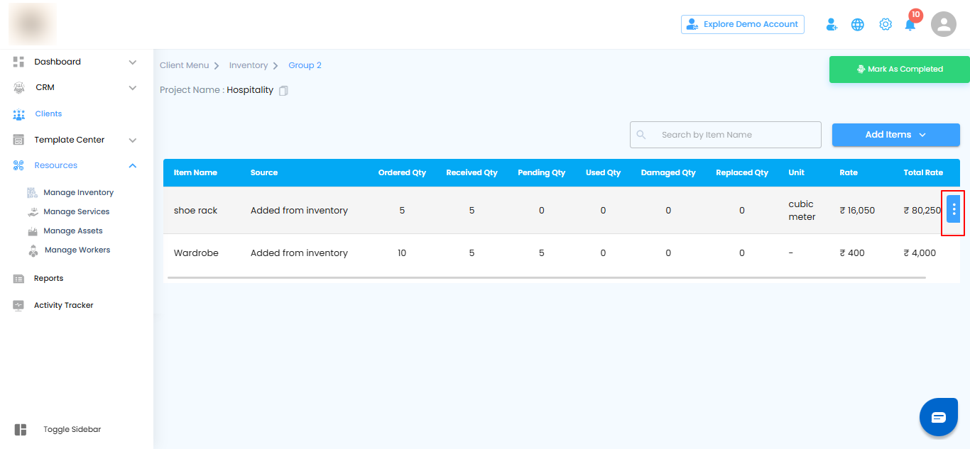 Once the items are added to the group’s inventory table, you have several options to manage them. Additionally, when you hover over an item, a three-dot menu will appear at the end of the row.