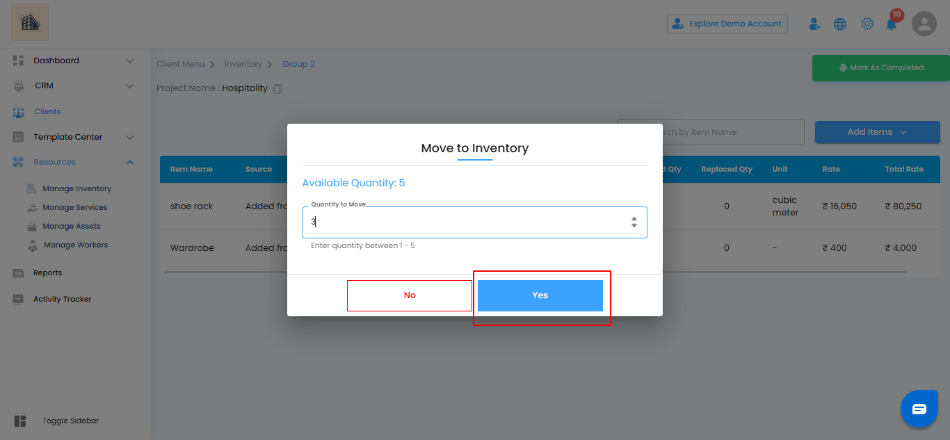 When you click Move to Inventory, a pop-up will appear showing the Available Quantity the number of units currently left in the group