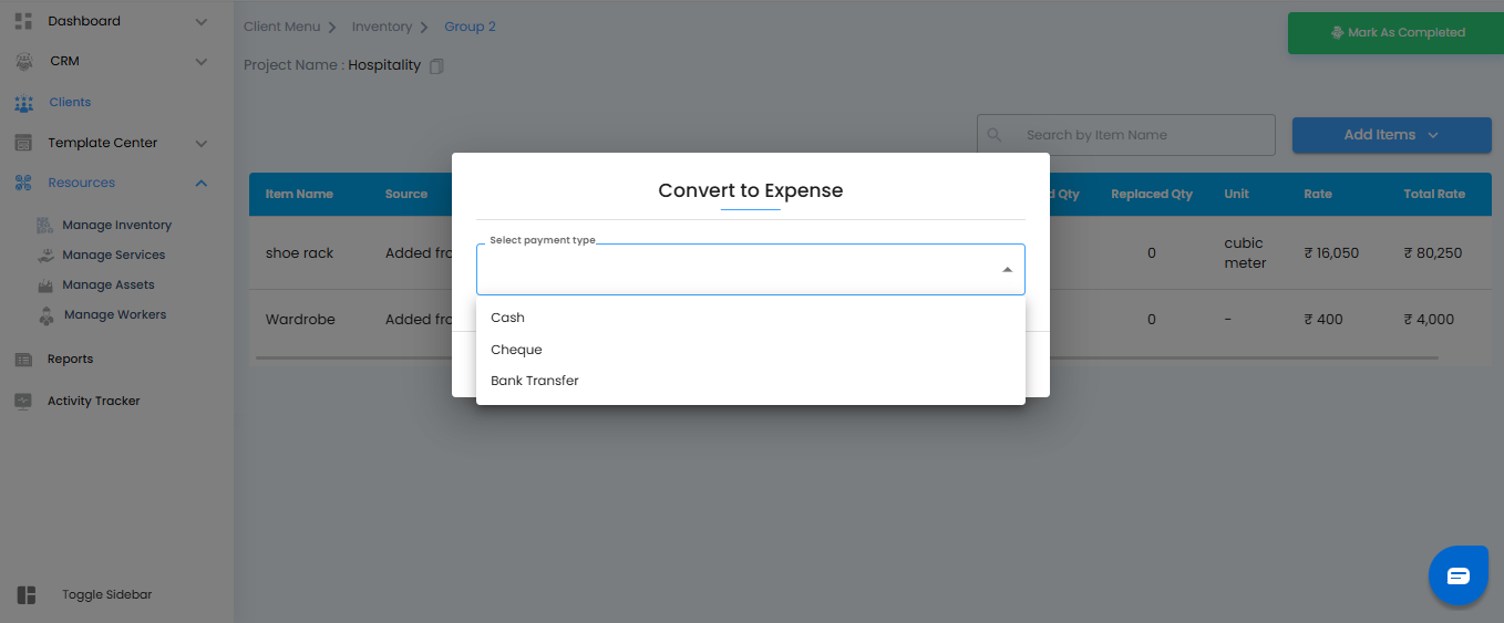If an item in the group needs to be recorded as a project expense, you can convert it directly from the table.