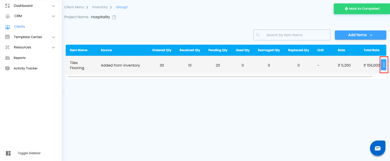 - Hover over the item in the Items Table, and a three-dot menu will appear at the end of the row.