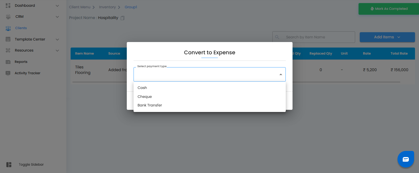 - In the Convert to Expense popup, use the Select Payment Type dropdown to choose the method of payment: