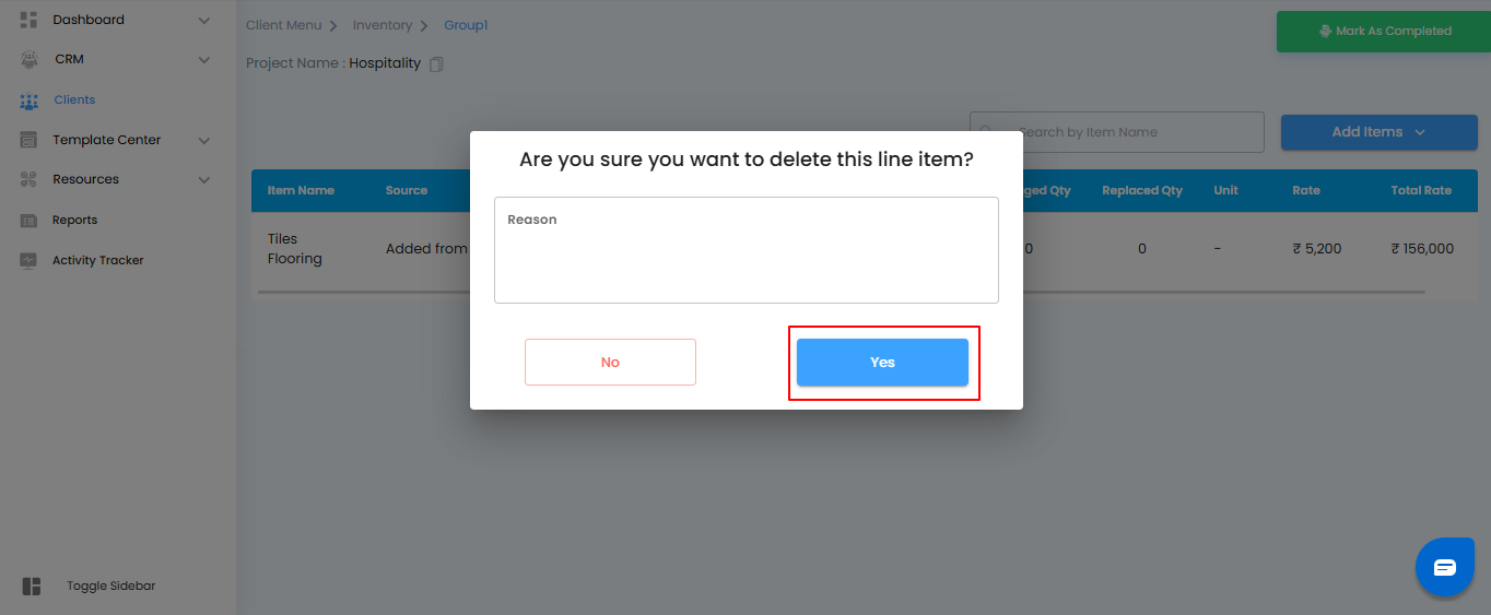 - A confirmation popup will appear asking if you are sure you want to remove the item.