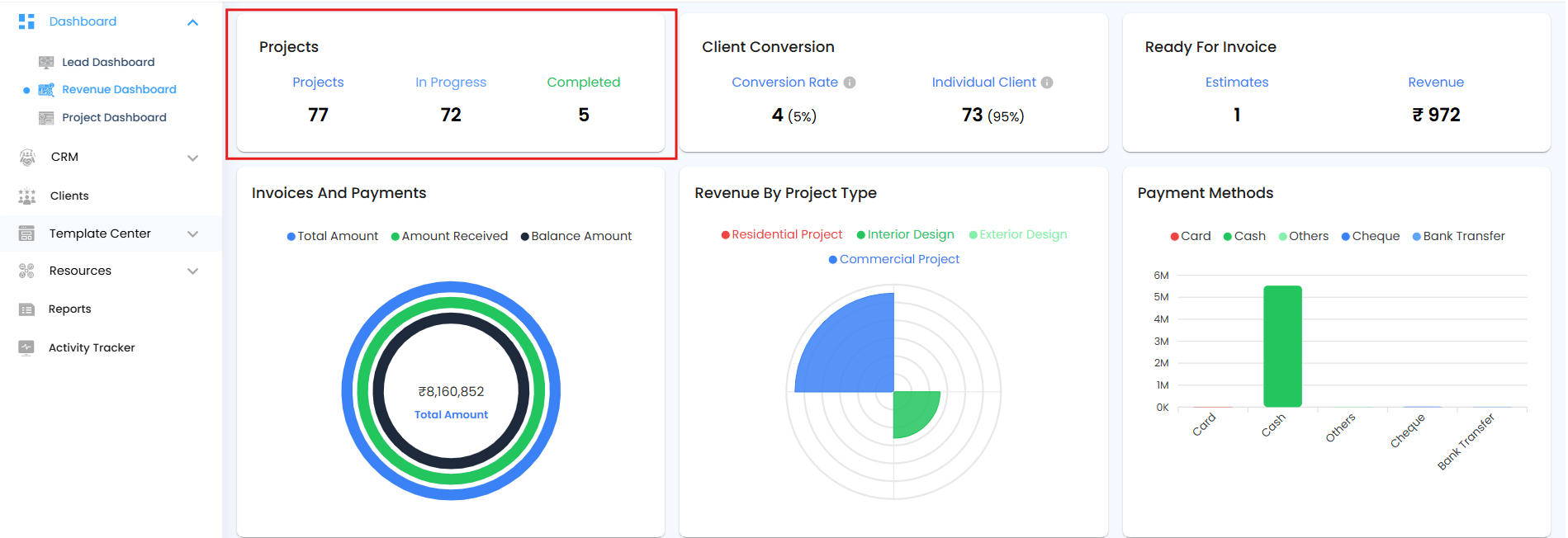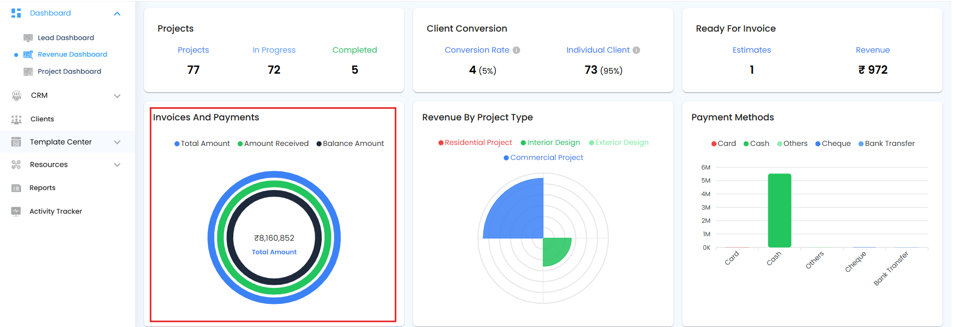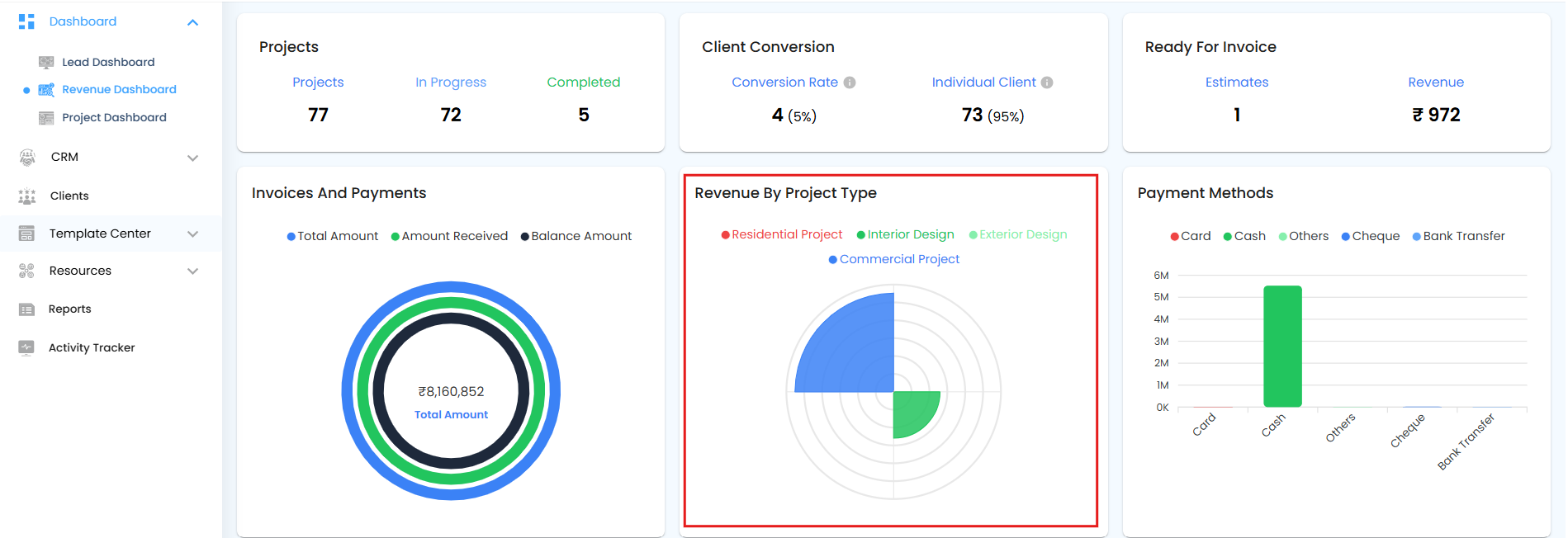 The Revenue by Project Type Pie Chart displays the distribution of revenue based on the total invoice amounts for each project type. This helps you quickly understand which types of projects contribute the most to overall revenue.