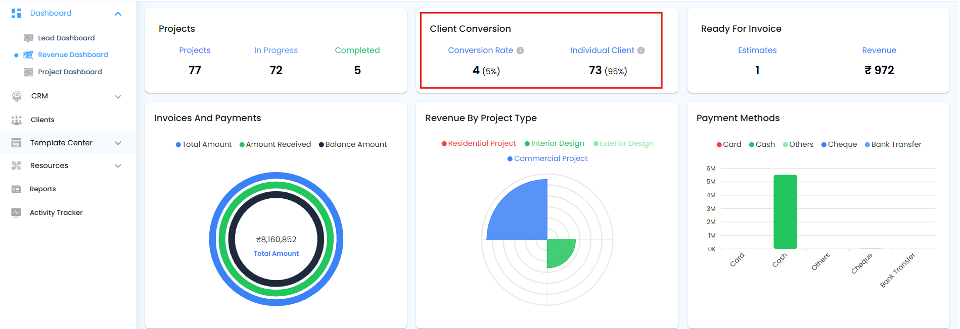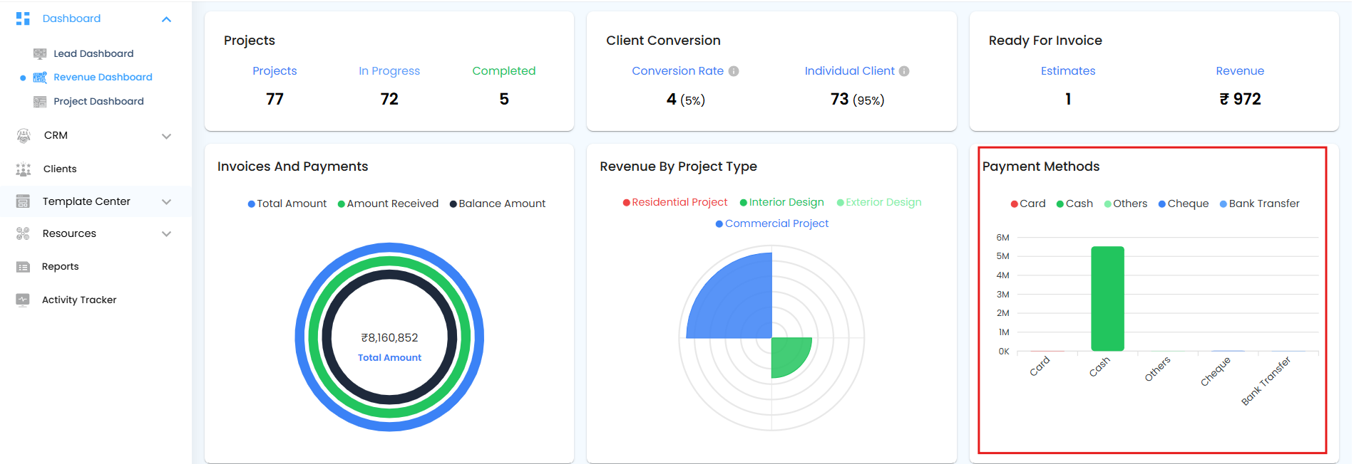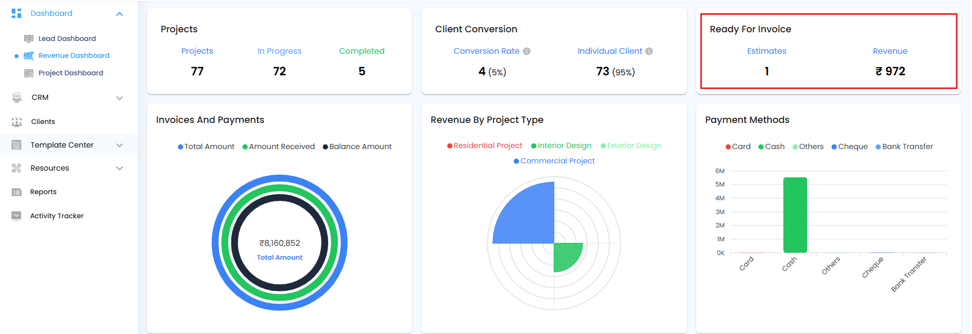 The Revenue by Project Type Pie Chart displays the distribution of revenue based on the total invoice amounts for each project type. This helps you quickly understand which types of projects contribute the most to overall revenue.