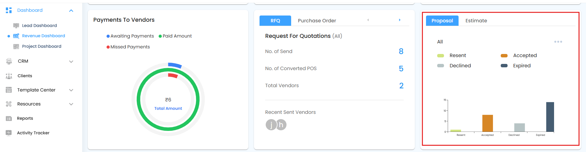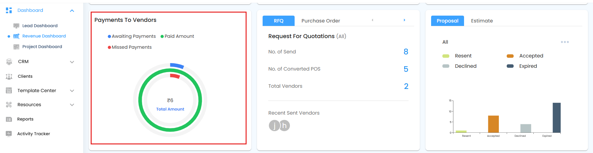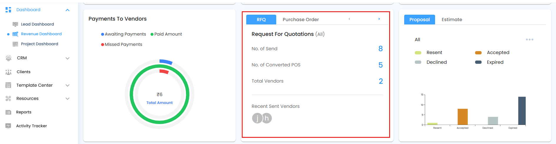 - Recent Sent Vendors: Lists the most recently contacted vendors through RFQs.
